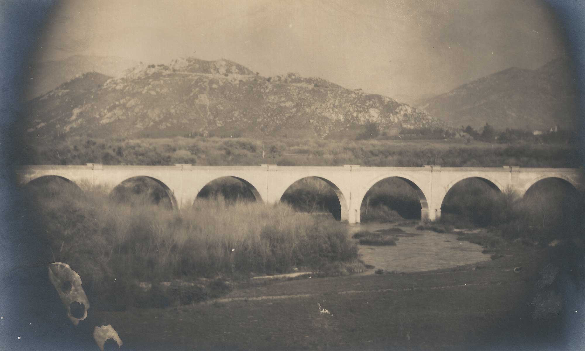 Looking southwest from the heights of Mount Rubidoux, a bridge of remarkable beauty and engineering stretches across the Santa Ana River. Located at the Narrows, the site at which, in both 1774 and 1776, Juan Bautista de Anza crossed the river on his overland journey from Tubac, Mexico, to the San Francisco Bay area, this bridge was built by the San Pedro, Los Angeles, and Salt Lake Railroad in the very early years of the Twentieth Century. Today, the site borders the city of Riverside’s Martha McLean - Anza Narrows Park.