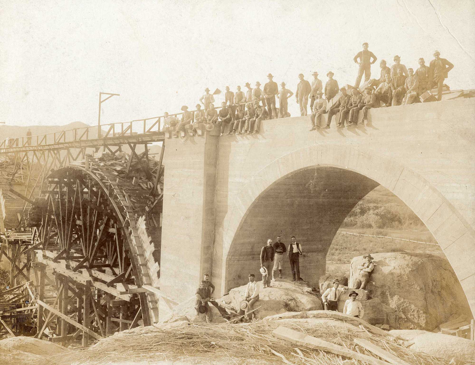 At about 9 a.m. on Tuesday, February 3, a special train left Los Angeles carrying officials, dignitaries, and friends from the Salt Lake Railroad on an excursion to the Santa Ana River bridge site. They arrived at the crossing at about 1 o’clock to thoroughly inspect the bridge's progress. Congressman M. J. Daniels, H. T. Hays, and Frank A. Miller joined in the inspection from Riverside. Another eight to ten months were needed to complete the bridge. In March, the wooden frame timbers around three of the eight arched spans were in place and ready for the concrete. At that point, a dozen steam engines and 190 men were employed at the bridge work, with more men and equipment to be added as the cement work started.