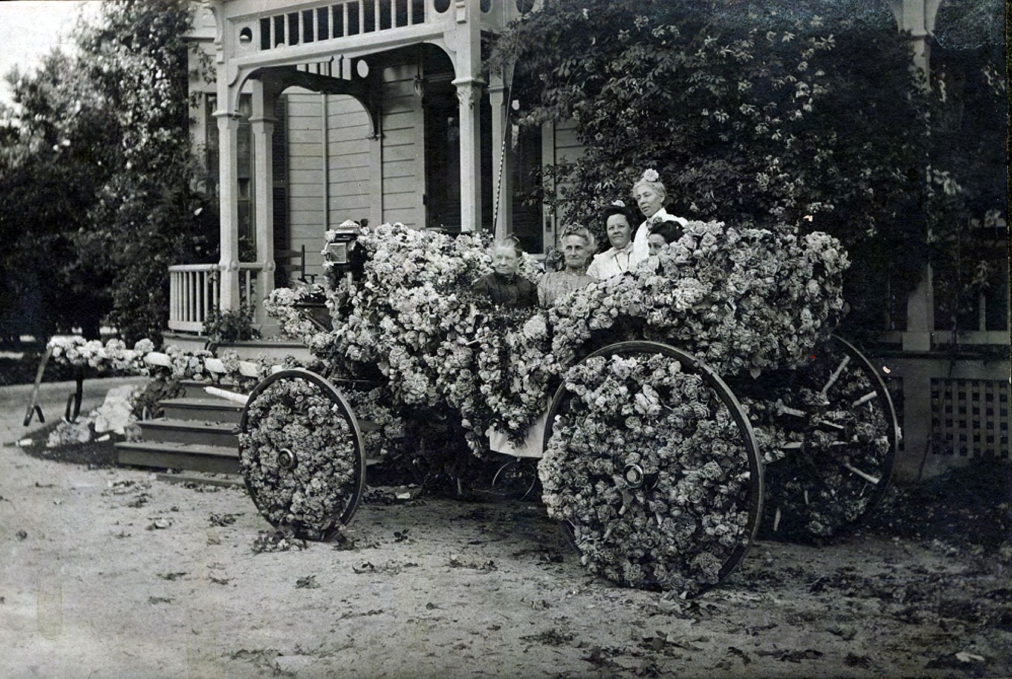 The reason for disembarking at Pachappa was for the tour and parade that the committee had developed for Roosevelt to see part of the city and then enter downtown triumphantly for his speech. There at Pachappa station, at ten minutes after six, he was greeted and given a carriage ride from the depot on Jane Street. Eleven highly decorated carriages welcomed the train and its passengers. Instead of flooding the street with roses as they did in Redlands, the women of the Riverside Woman’s Club decorated the carriages and horses. The President’s carriage was decorated in the yard and under the supervision of Mary E. Darling, a Riverside community leader (Woman’s Club, Pioneer Historical Society, Wednesday Club, and other organizations). Mrs. Darling instructed the women to be at her home at 222 E. Arlington Avenue (later 3650 Arlington Avenue and today part of Shamel Park) by 9:00 am the morning of the President’s arrival. The carriage decorated for Roosevelt was the same carriage used to transport President Benjamin Harrison on his visit to the city of Riverside on April 23, 1891. It was covered with pink La France roses, the wheels were intertwined with garlands of Marechal Neil roses, and the horse collars had yellow roses. Bicycle riders and horseback riders followed the carriages making quite a procession.