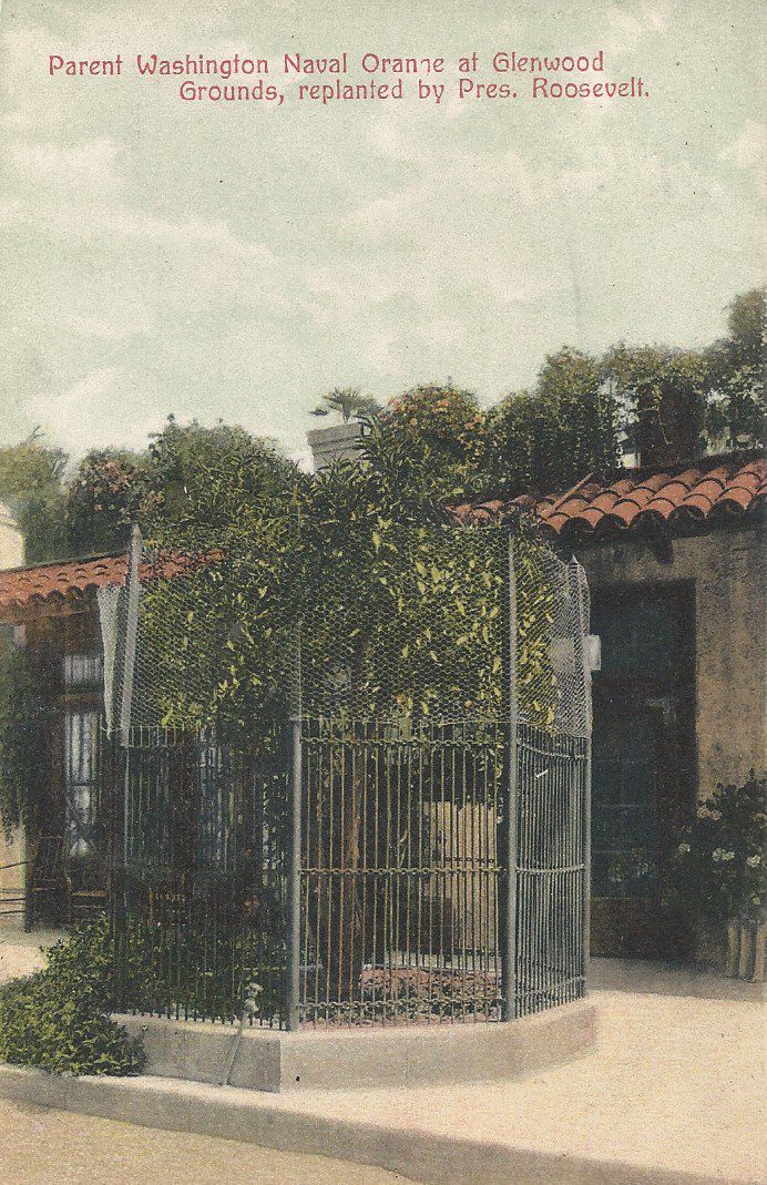 By the summer of 1918, both original Parent Navel Orange Trees, the one at the Mission Inn and the one at the corner of Magnolia and Arlington Avenues, were not doing well, and many feared they were dying. Dr. H. J. Webber and Dr. J. T. Barrett from the Citrus Experimental Station in Riverside were called in. The tree in the small city park at Magnolia and Arlington was saved, but the one at the Mission Inn was not able to be saved. By May of 1922, the paper declared, “The parent navel orange tree in the court of the Glenwood Mission Inn is dead and it will be removed and cut up for relics.”