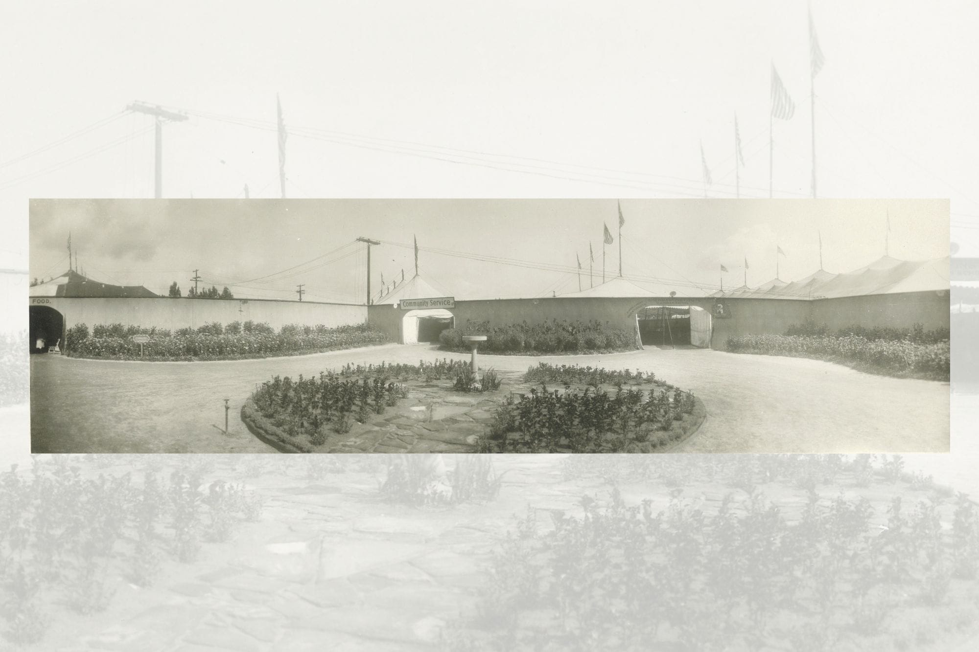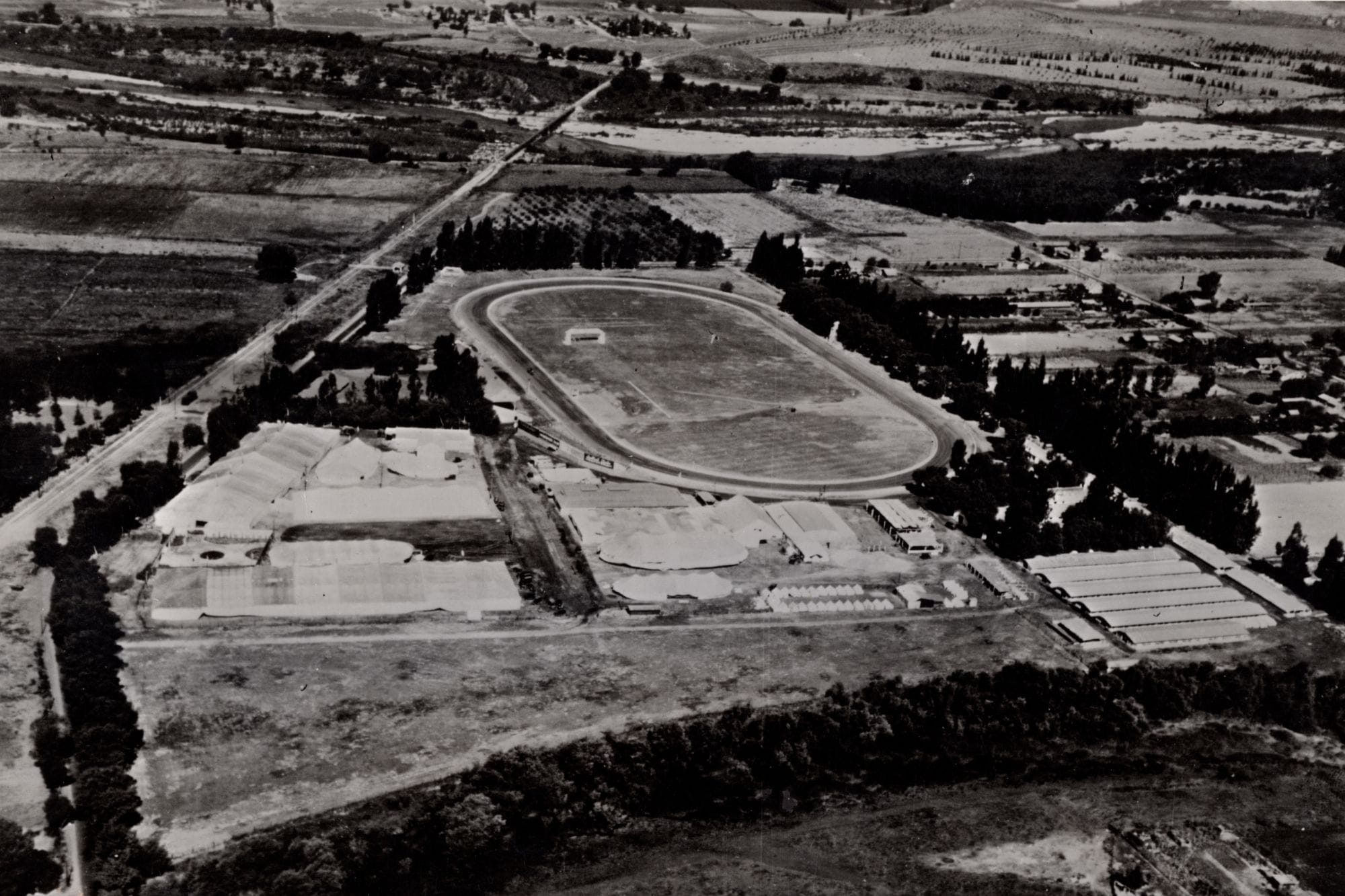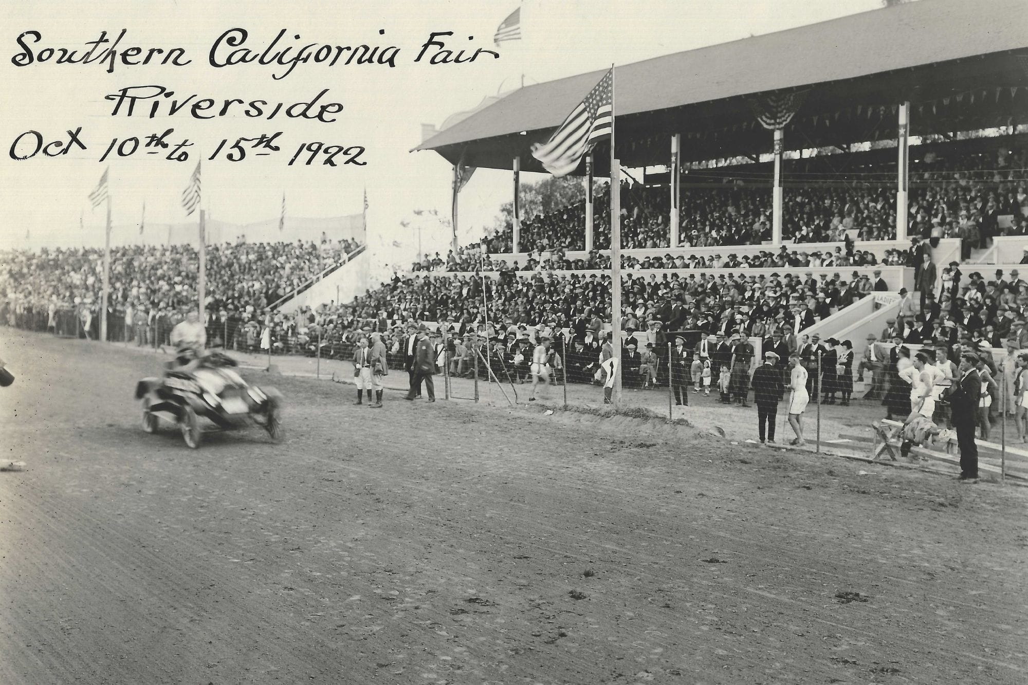 On April 10 of that year, a groundbreaking ceremony was held with much fanfare. A parade formed on Main Street in front of the Riverside County Courthouse, and at 3 p.m., a procession began to the site for the groundbreaking. The Daily Press reported: “Headed by the Riverside Military Band aboard a Moreland truck, and President J. F. Backstrand, of the County Fair Association, driving his prancing steed, Riverside’s merchants, even to ‘the butcher, the baker, and the candlestick maker’ turned out in an automobile parade full of 100 machines strong this afternoon to help celebrate the momentous occasion of the first breaking of ground on the new county fairgrounds.”