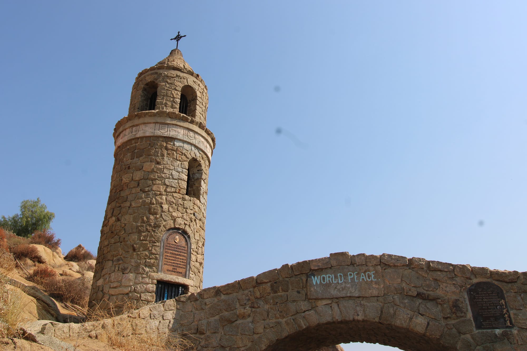 Several years before the 1985 event, the rope to ring the bell was removed. Neighbors below the mountain complained when individuals broke into the Peace Tower late at night and rang the bell, keeping them awake or disturbing their sleep. Riverside City Park Director Dee Bachman solved the problem of ringing the bell without a rope to pull. He rigged a hook around a pole borrowed from one of the city’s swimming pools and snared the bell’s clapper. He managed to ring the bell for five minutes, standing just a few feet below it. At the end of the time, he stated that his ears had had it and he might have to consider retirement.