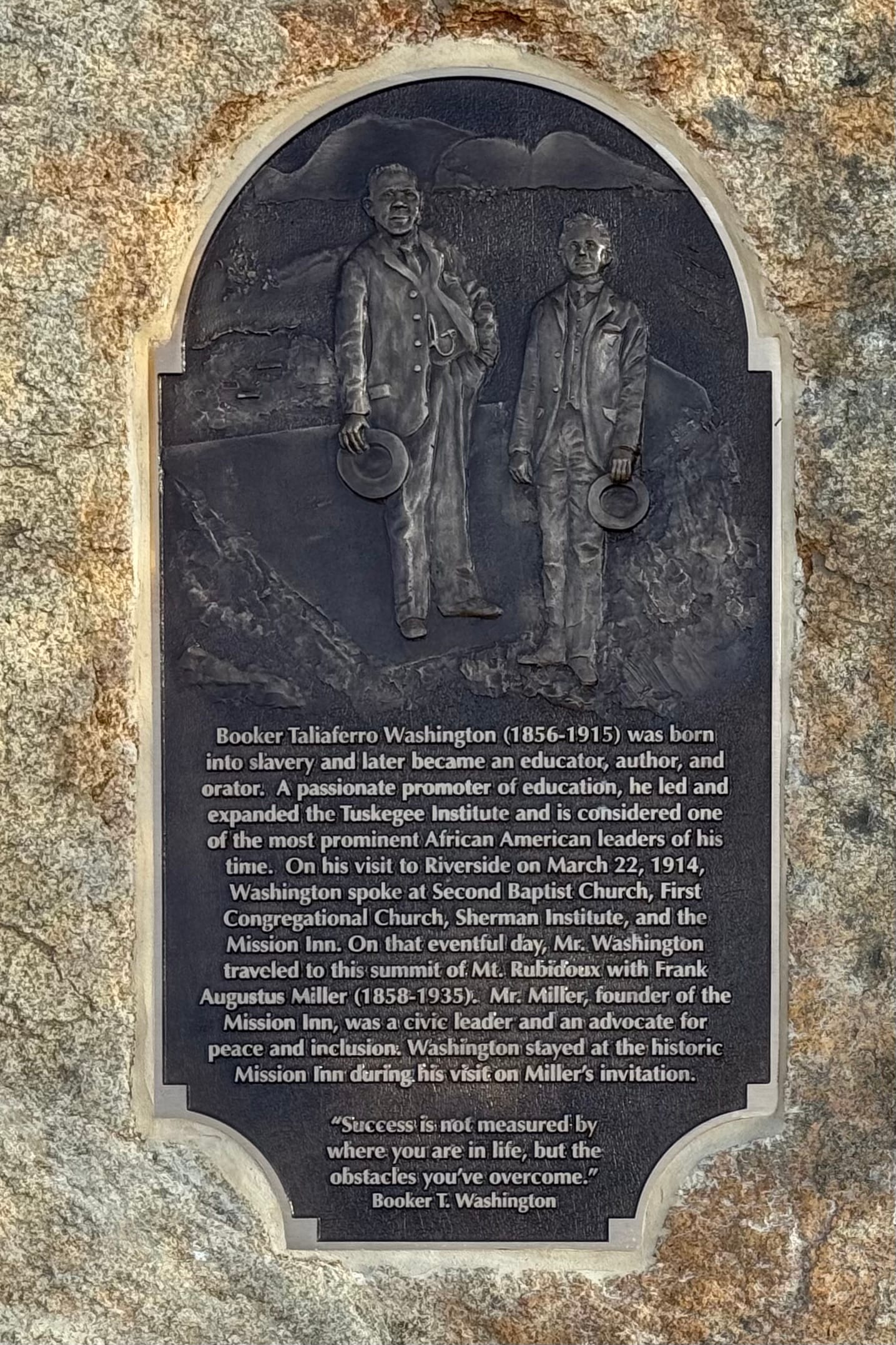 On a perfect Friday afternoon, on February 28, the last day of Black History Month, The Friends of Mt. Rubidoux, the Riverside African American Historical Society, and Riverside Parks co-sponsored the dedication of a tablet commemorating Booker T. Washington and Frank A. Miller's ascent of Mt. Rubidoux.