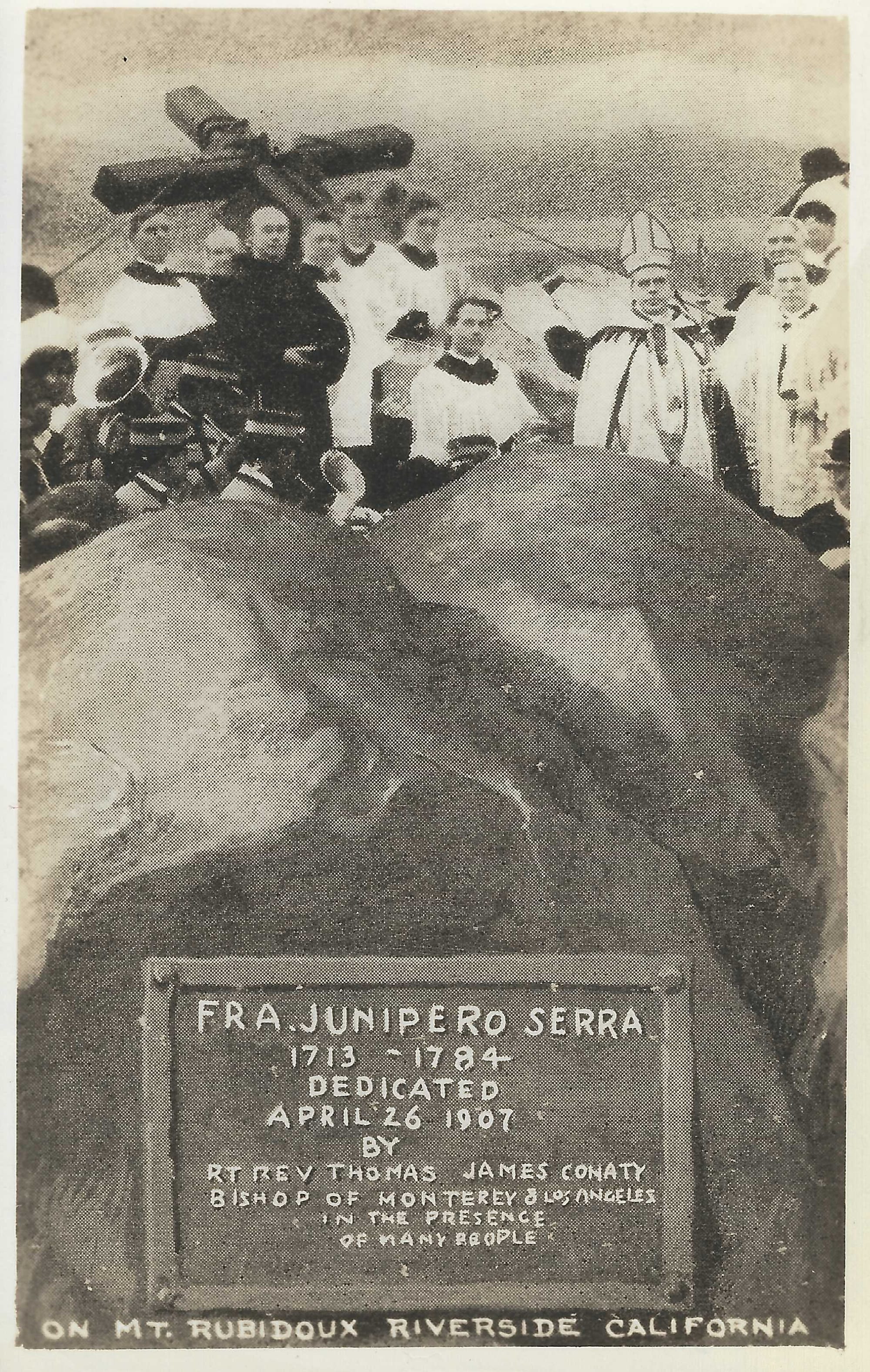 At the dedication of the road on Mount Rubidoux on February 22, 1907, Jacob Riis tied together events from California history by referring to the flag and the cross. Two months later, on April 26, Miller erected a cross on the summit of the mount. Below the cross, a tablet commemorating this event was set.