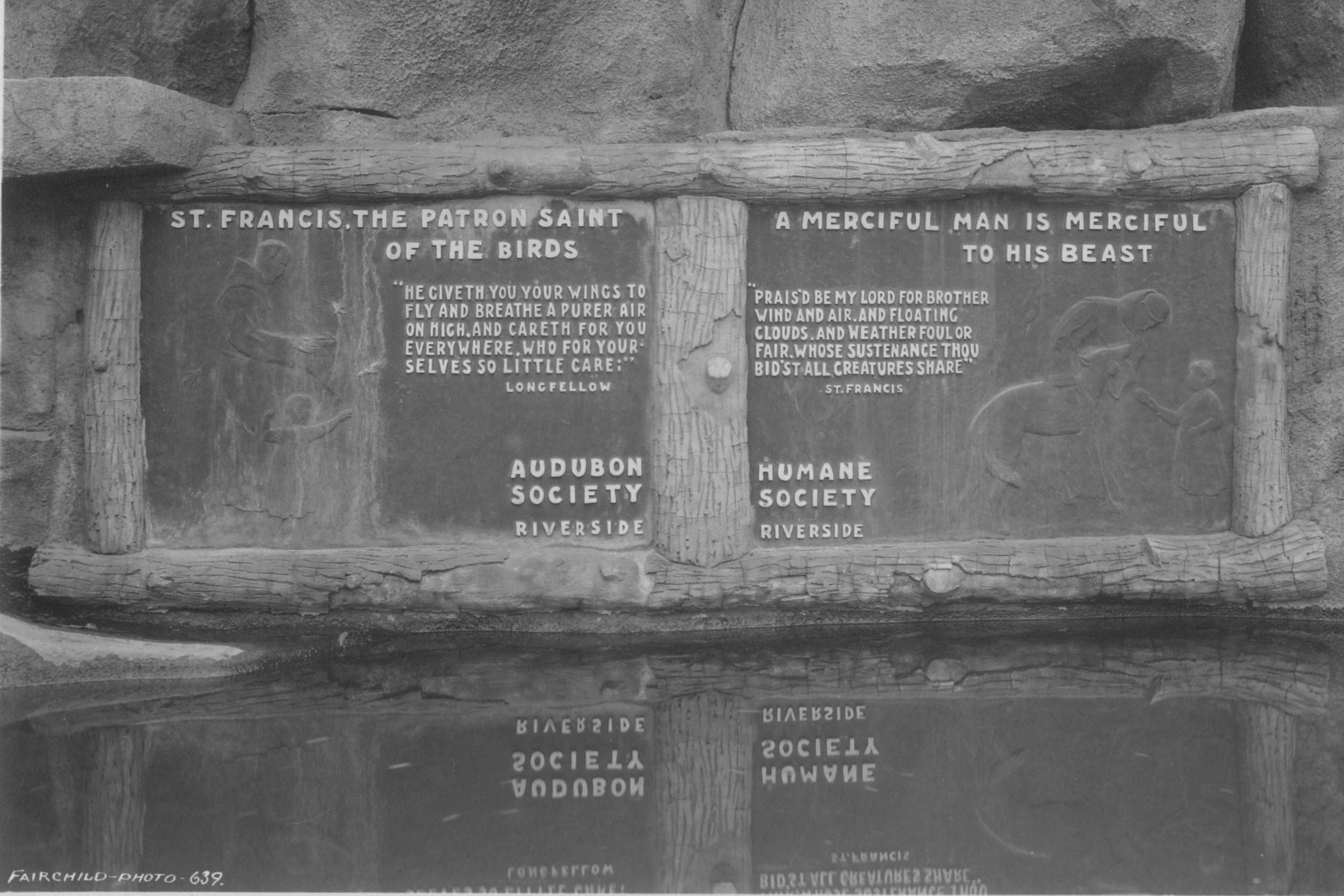 Frank Miller had varied connections and interests. That is demonstrated in the event on June 6, 1916. Bringing together the city, the state and county humane societies, the Audubon Society, the Landmarks Club, and officials from the Roman Catholic Church, the St. Francis Shrine and Fountain at the foot of the mountain was dedicated. Situated at the base of the mountain at the western entrance to the city, a fountain, and shrine were dedicated to St. Francis of Assisi. Often referred to as a lover of animals and birds, St. Francis has been portrayed in works of art preaching to the birds. Two tablets, one by the Audubon Society and one by the Humane Society, were part of the shrine.
