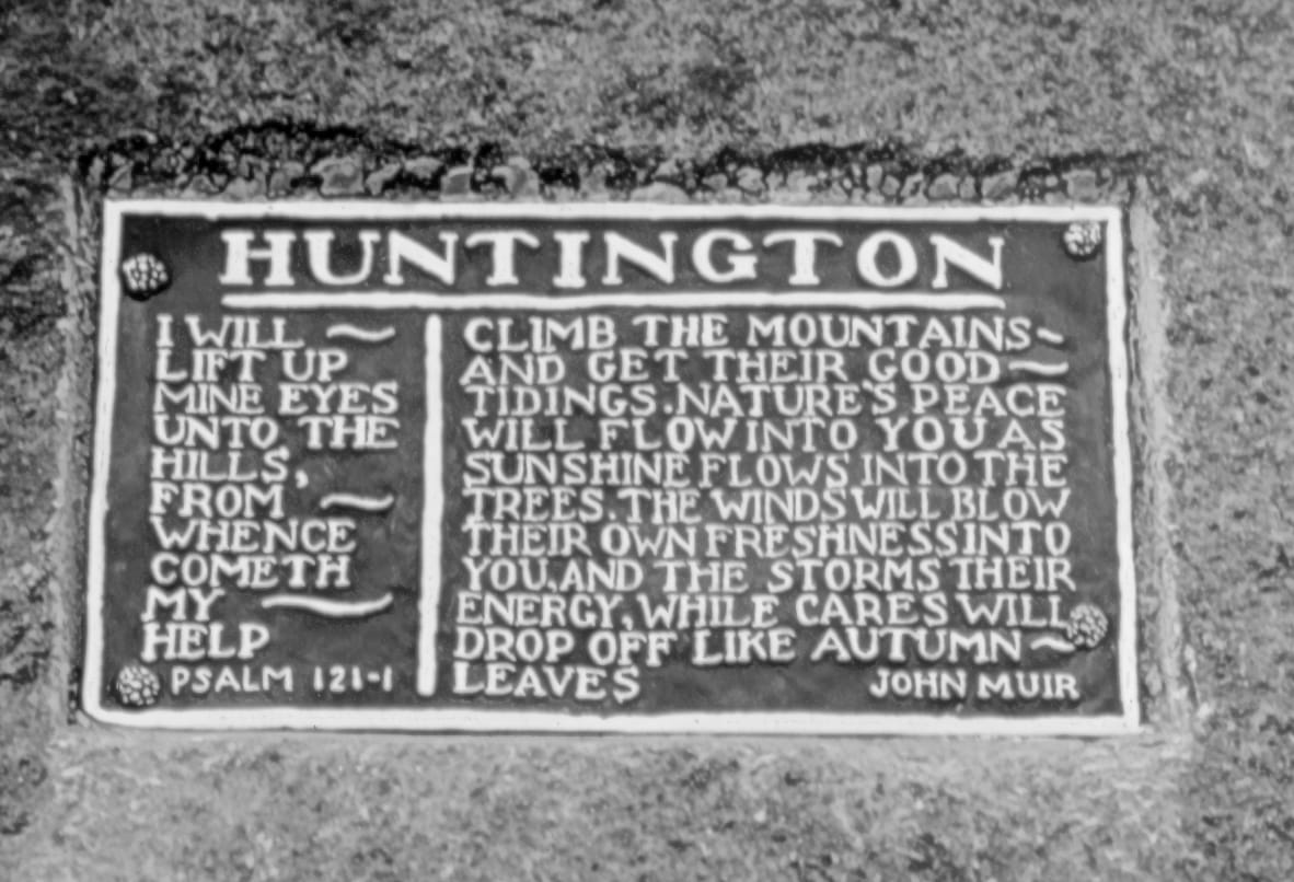 A few months later, the next tablet was added to honor Henry Huntington, the major financial supporter of the development of Mt. Rubidoux. The bronze tablet was on a boulder near the meeting point of the up-and-down road on the mountain's eastern side. On the top, in large capital letters, is HUNTINGTON. Below the name is the verse from Psalm 121:1, “I will lift up mine eyes to the hill…” and a quote from John Muir, “Climb the mountains…”