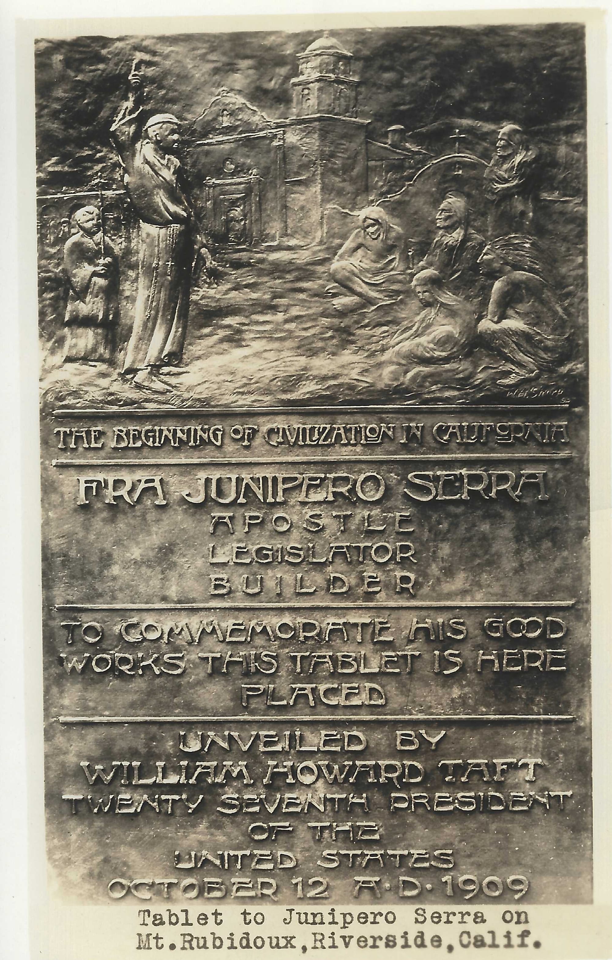 President William Howard Taft arrived in Riverside by train on October 12, 1909. Greeted by dignitaries at the station, Taft was given an automobile ride up the road to the top of Mount Rubidoux. He was instructed to pull a cord, which unveiled the next tablet. Supposedly, Taft complained that if he had been told before what was happening, he would have prepared a speech.