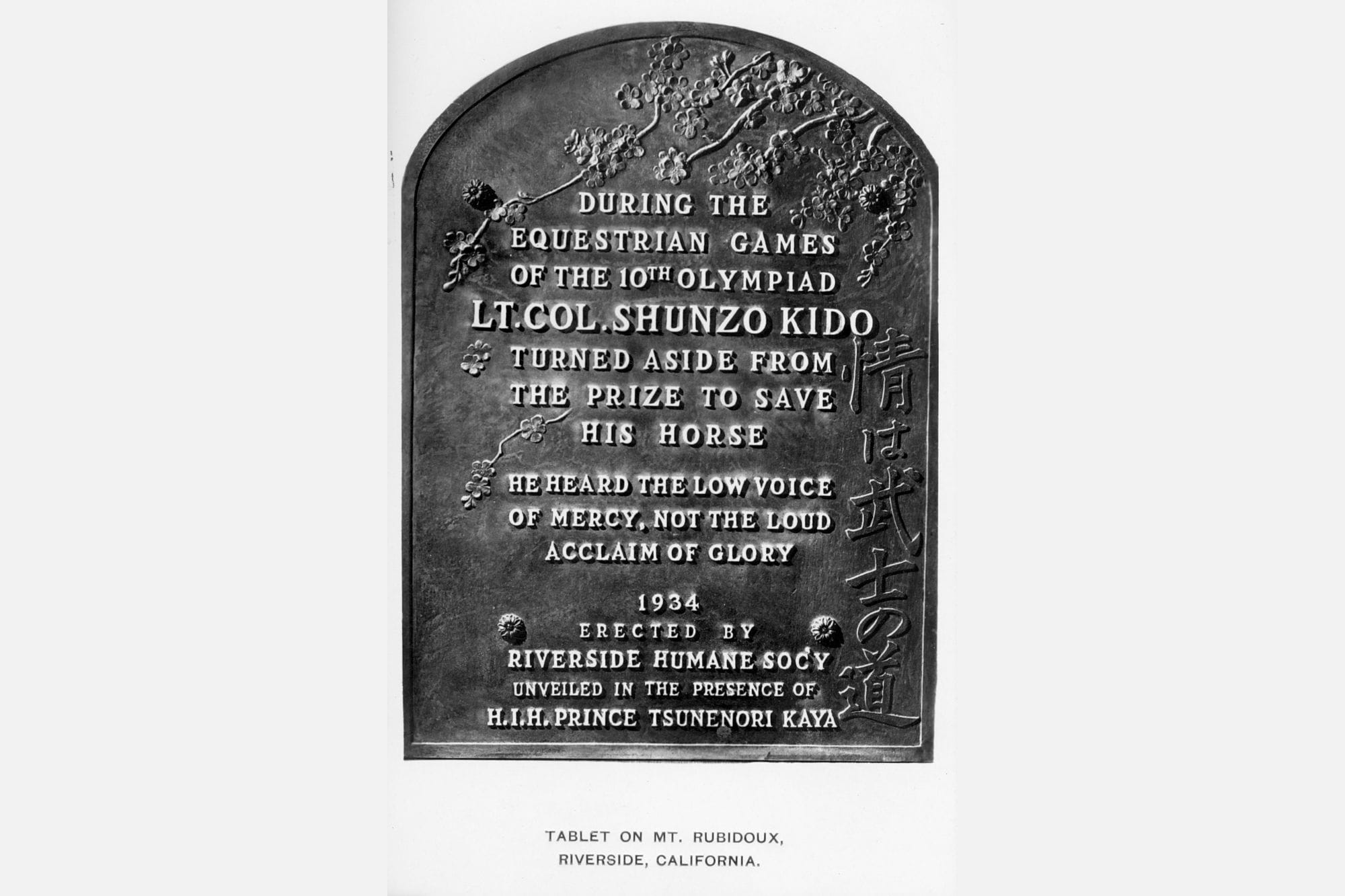 Prince and Princess Tsunenori Kaya, members of the Japanese royal family, arrived in Riverside. After a meal at the Mission Inn, they were taken by automobile up Mount Rubidoux to the Peace Tower. There, they witnessed the unveiling of a tablet honoring Colonel Shunzo Kido. Kido was an equestrian at the 1932 Olympics in Los Angeles. Using his experience and the strong ability of his horse, he found himself leading the race and almost assured of the gold medal. However, he felt his horse faltering with only one jump left and less than a mile. He knew that if he pushed hard, the horse would drive himself to the finish. But the rider realized that by winning the race, he might likely push his horse to its death. In a selfless act of kindness, Kido pulled his horse to a stop, dismounted, and then walked the exhausted horse to the finish line. They were disqualified and lost the medal that they could have won.