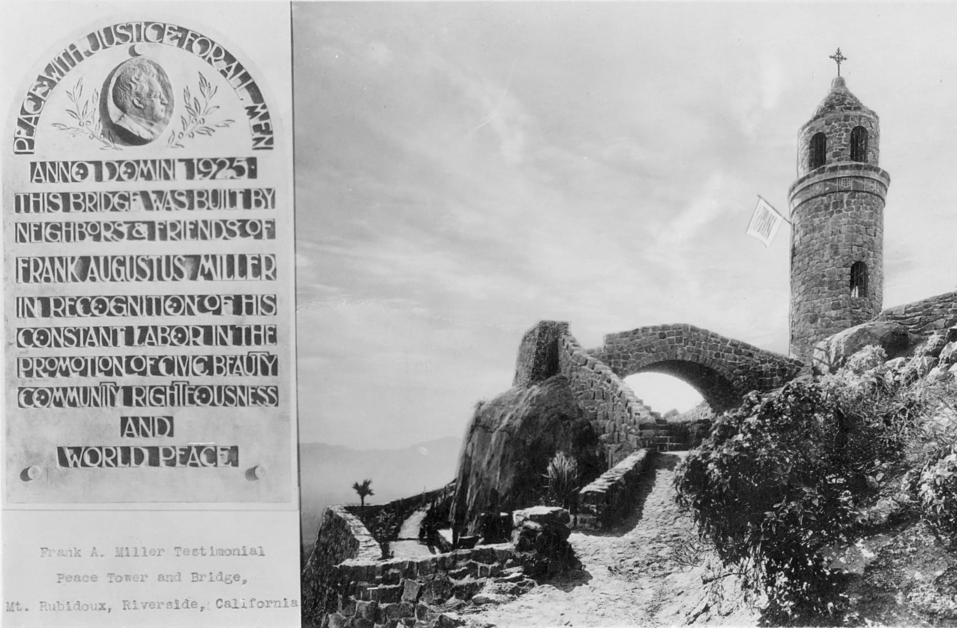 While Frank Miller was away for six months in the Far East in 1925, Riverside's citizens planned to build a monument in his honor. Arthur B. Benton, who had designed the first two wings of the Mission Inn, designed the Frank A. Miller Testimonial Peace Tower and Bridge. After Miller returned to Riverside, the Peace Tower was dedicated in his honor on December 12, 1925. On the side of the tower is the tablet recognizing Miller’s advocacy for World Peace.