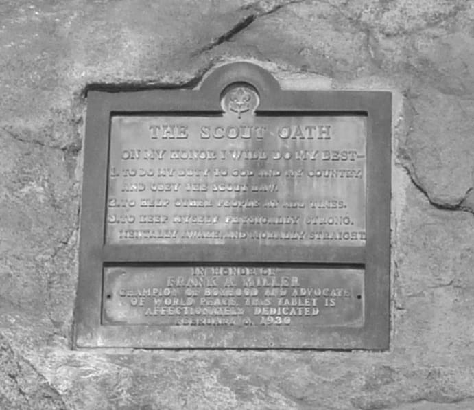 In February of 1930, the Boy Scout troops in Riverside joined with others nationwide in celebrating the twentieth anniversary of the founding of the Boy Scouts of America. During this week-long celebration, the local scouts honored one of their biggest supporters and a county council executive board member: Frank A. Miller. At 2:30 in the afternoon of Saturday, February 8, the scouts gathered on the summit of Mount Rubidoux to raise the flag, recite the pledge of allegiance, sing America, and then unveil a bronze plaque in honor of Frank Miller.