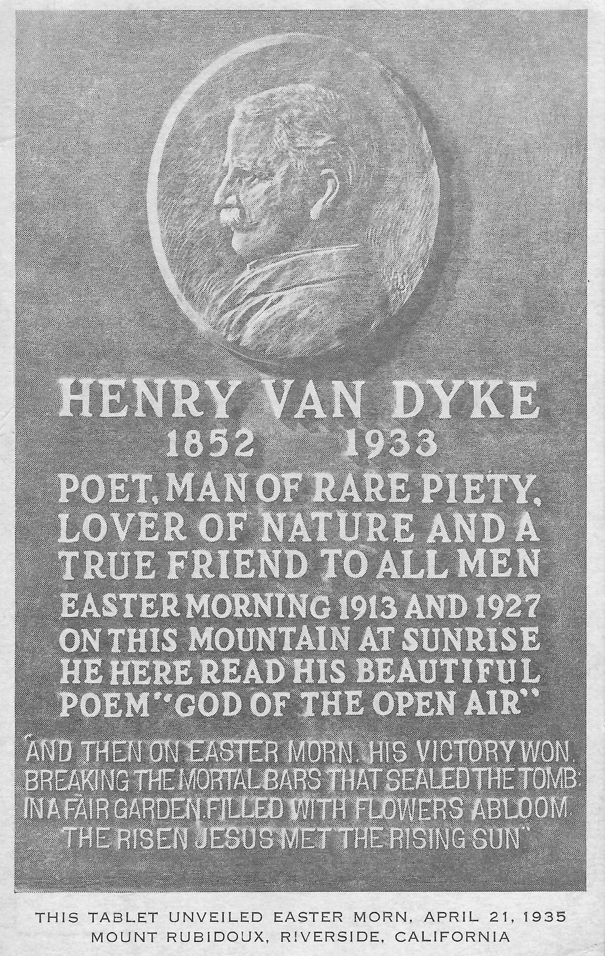 In 1913 Dr. Henry Van Dyke participated in the annual Sunrise Easter Service on Mount Rubidoux and read his poem, God of the Open Air. For the occasion, he added four lines that proclaimed the Easter message. Van Dyke had returned to Riverside in 1927 for the service to read his poem again. Six years later, Dr. Van Dyke died in April 1933 at the age of 81. Two years afterward, at the Easter Sunday Service on April 21, 1935, the Reverend Tertius Van Dyke, Henry’s son, was a guest at the service. He had the privilege of reading his father’s poem during that service. One source states that after reading the poem, the son unveiled a bronze tablet designed by William Sharp in honor of his father. The service program for that day reads that Frank Miller Hutchings did the unveiling. Most likely, they both took part in the ceremony. On the tablet are inscribed the words that Van Dyke added in 1913.