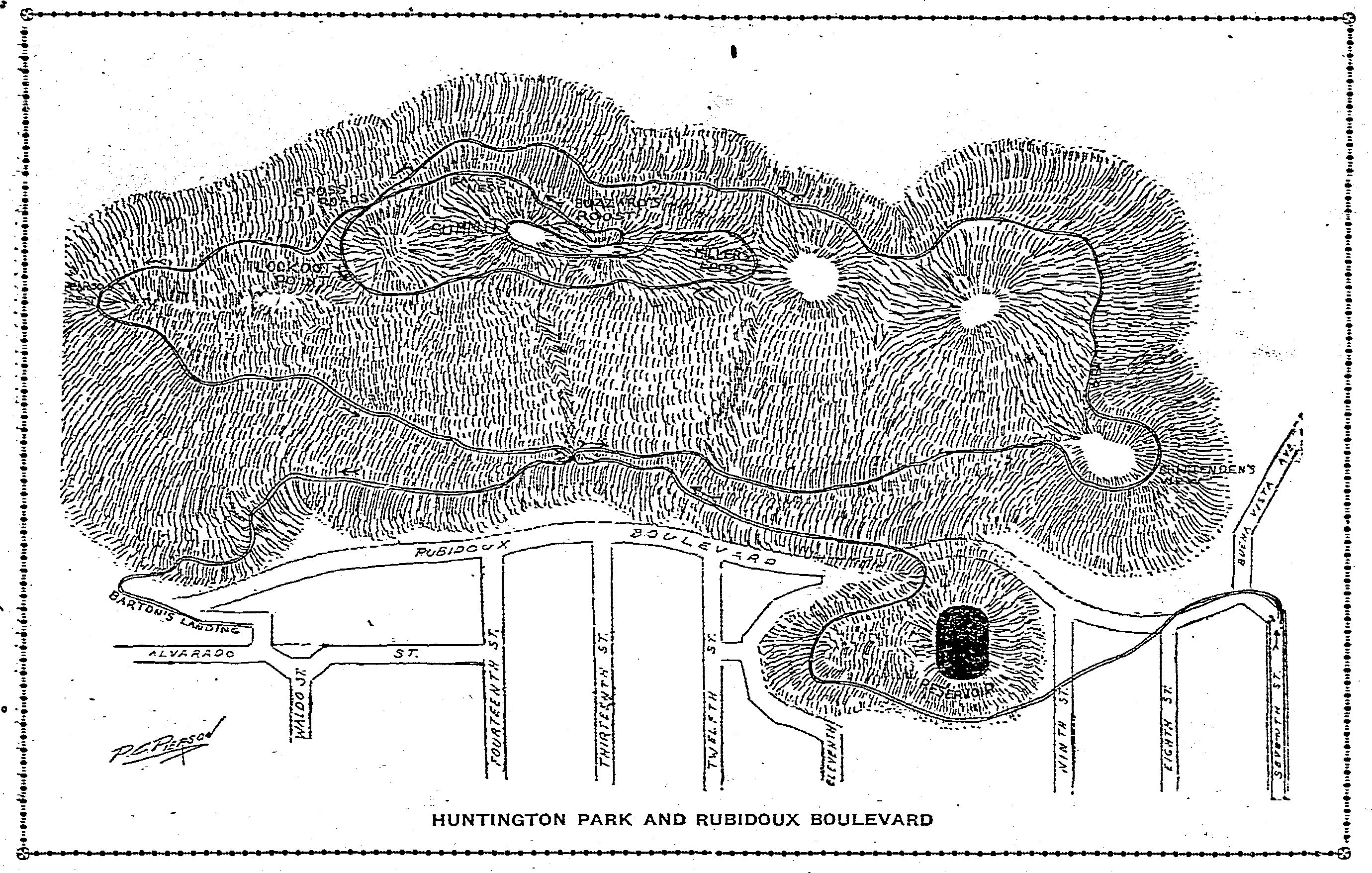 As Frank Miller, part of the Huntington Park Association, developed Mt. Rubidoux, he hired Hiram Chittenden of the Army Corps of Engineers to design a road up and down the mountain for tourists. As travelers left the Mission Inn and drove up Seventh Street, they had to connect to the road, Huntington Drive, that was being built. They did this via an incline at the end of Seventh Street, which bent to the left and crossed over Buena Vista Avenue. The bridge over the road was designed by Arthur Benton, architect of the Mission Inn. His original plans called for only the roadway, but he revised them to include a pedestrian walkway on one side.