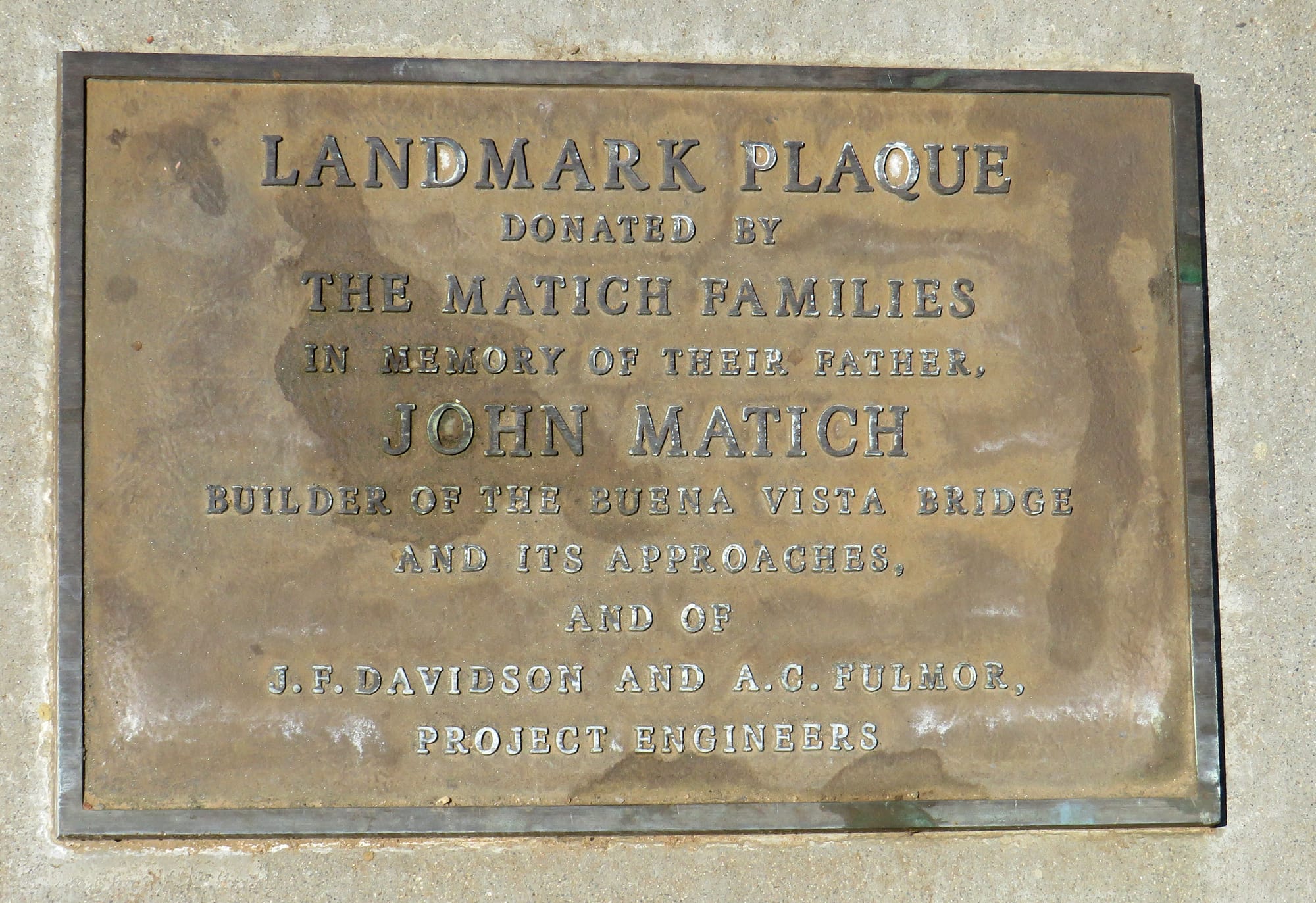 In 1987, the family and friends of John Matich of Matich Brothers nominated the Buena Vista Bridge as a city landmark. The Cultural Heritage Board resolved that “the Buena Vista Bridge be designated Cultural Heritage Board Landmark #74” and that the bridge’s surfaces, including its Hollywood-style light fixtures, are included within this landmark designation. Plaques were placed at both ends of the bridge.