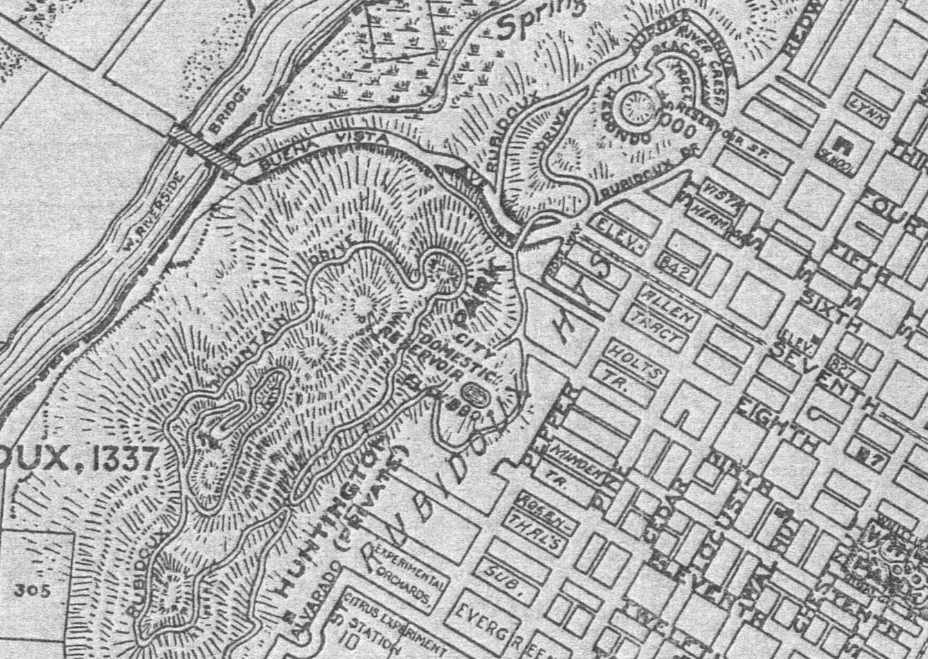Good View, or in Spanish Buena Vista, is the name of a short segment of road that curves around the northern edge of Mt. Rubidoux, connecting Seventh Street (now Mission Inn Avenue) to Mission Boulevard across the Santa Ana River in Jurupa Valley. No one seems to know why this segment was named Buena Vista Avenue (sometimes referred to as Drive). Was it for the good view of Mt. Rubidoux on one side and Little Rubidoux on the other? Or was it the view as travelers crossed the Santa Ana River and entered Riverside? Buena Vista begins at the end of Seventh Street, near today’s Afron Way (Rose Way on early maps), and extends to the river.