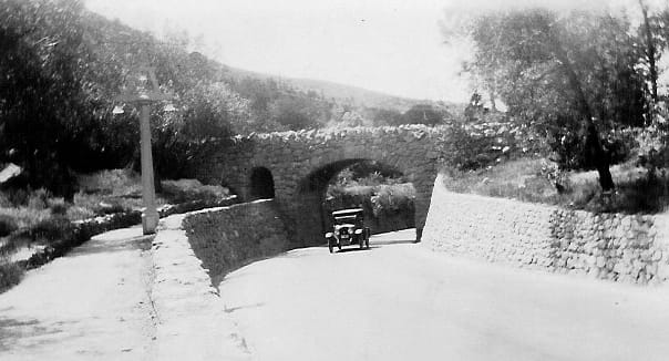 From left to right: [Photo of early Buena Vista Bridge from the base of Mt. Rubidoux, with Loring property on the far side of the bridge and Little Rubidoux at the upper left edge. Seventh Street runs east toward downtown in the middle of the photo (Courtesy of Marjorie Kjellburg Conry), Early photo of a car passing under Buena Vista Bridge. (Courtesy of Nancy Cox)