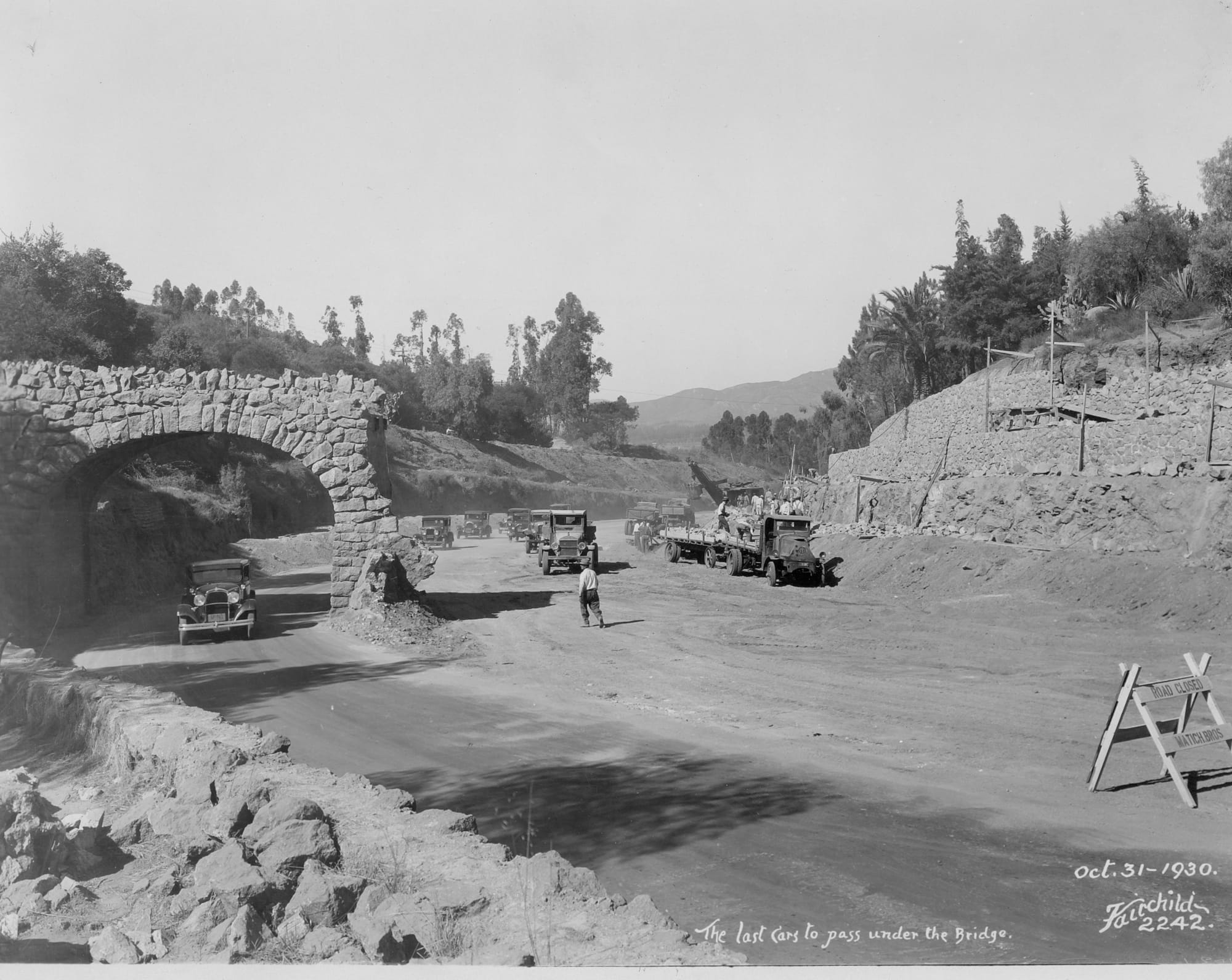 At the same time, Frank Miller persuaded the city of Riverside to undertake an elaborate project to beautify and widen the western entrance into Riverside at the base of Mt. Rubidoux. This required replacement of the bridge over Buena Vista Avenue, which had been built in 1907 as part of the original entrance for Huntington Drive to ascend Mt. Rubidoux. The total cost of this project to the city was $60,000, a vast sum in those Depression days.