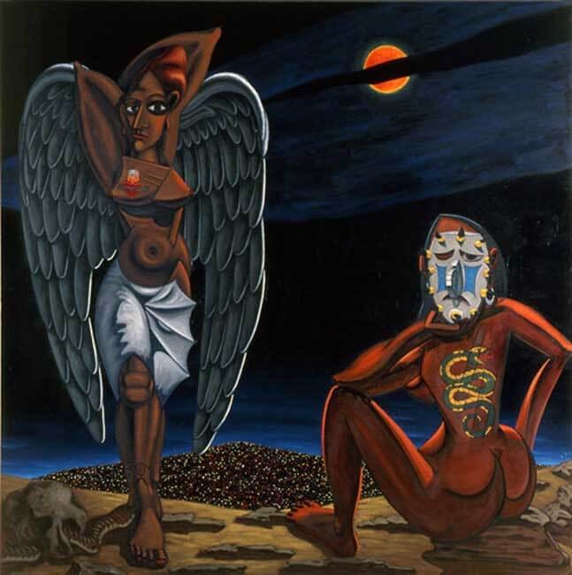 The painting transforms Picasso's original in ways that feel both familiar and revolutionary. Huerta maintains Picasso's angular faces and geometric fragmentation but replaces African masks with Aztec imagery and European prostitutes with border women from Juarez. Most striking is his addition of LoterĂa symbols: the viper from traditional Mexican bingo appears painted on one figure's body.