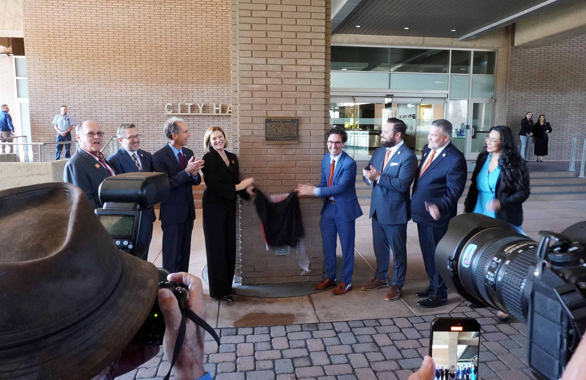 The ceremony concluded with the unveiling of the landmark plaque at City Hall's main entrance, followed by a group photograph of all current and former elected officials on the building's front steps.
