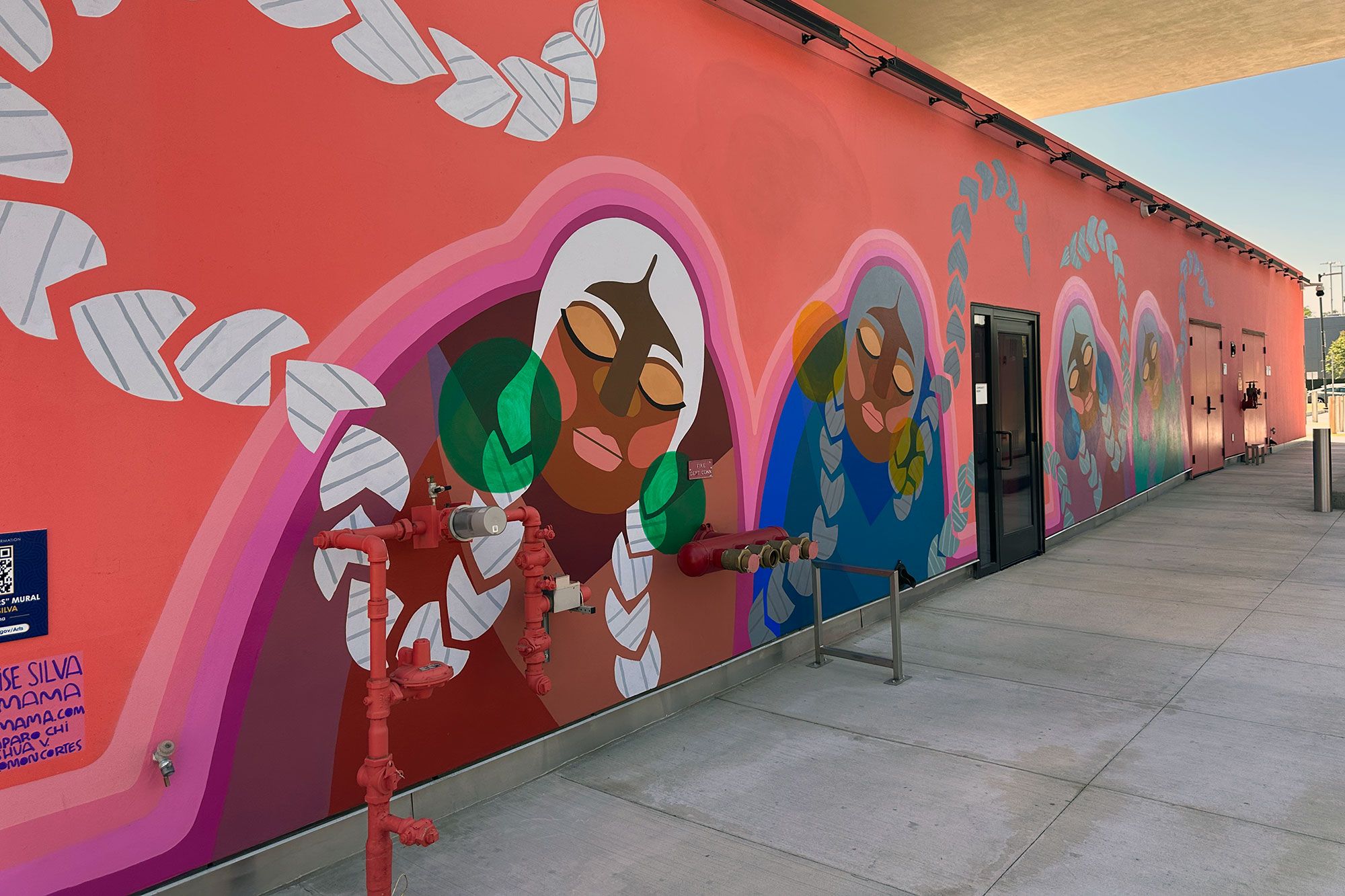 Silva was born in East L.A. and raised in Riverside. She studied design and illustration at California State University, Los Angeles, and works from her home studio in Riverside. “Creating this mural for my city was divinely inspired, and I can’t describe the feeling I get when I drive past the library and see our native grandmothers shining in the sun. So much love and intention went into this project, from researching and honoring each indigenous tribe to creating the art, painting the mural with my community, and designing coloring pages as a resource for teachers and homeschooling parents. I hope the mural inspires others. I hope our community can see themselves and their loved ones in the art and that each person will experience a spark of ancestral memory,” says Silva.