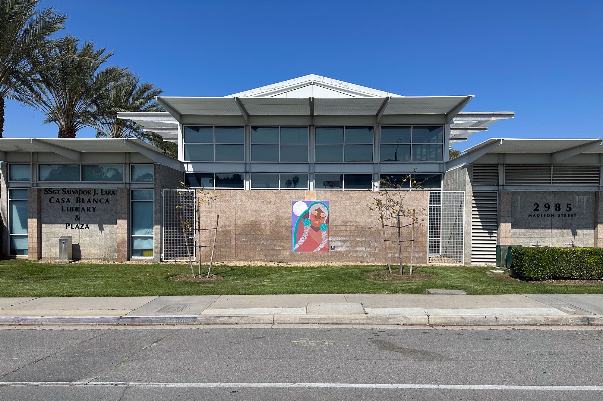 Grandmothers doesn’t just stop downtown; four smaller grandmothers are printed on metal and installed at the Arlanza, La Sierra, Orange Terrace, and Casa Blanca branch libraries. Silva says the colors of the murals represent “our collective skin color as well as our Inland Empire landscape.” She continues, “The murals are “totems – spiritual guardians – for those who respect the divine feminine and ultimately, Mother Earth, who is our oldest ancestor.”