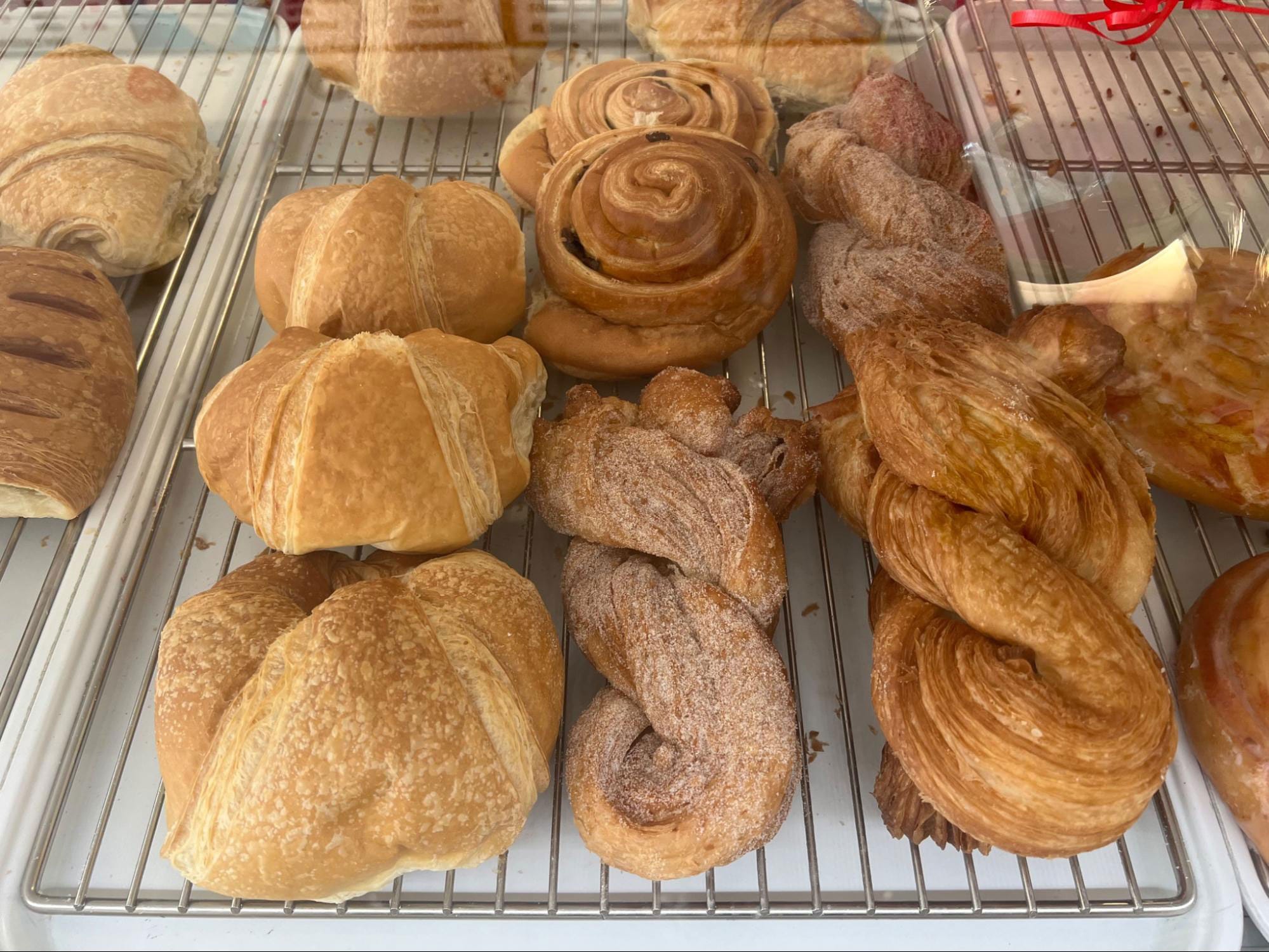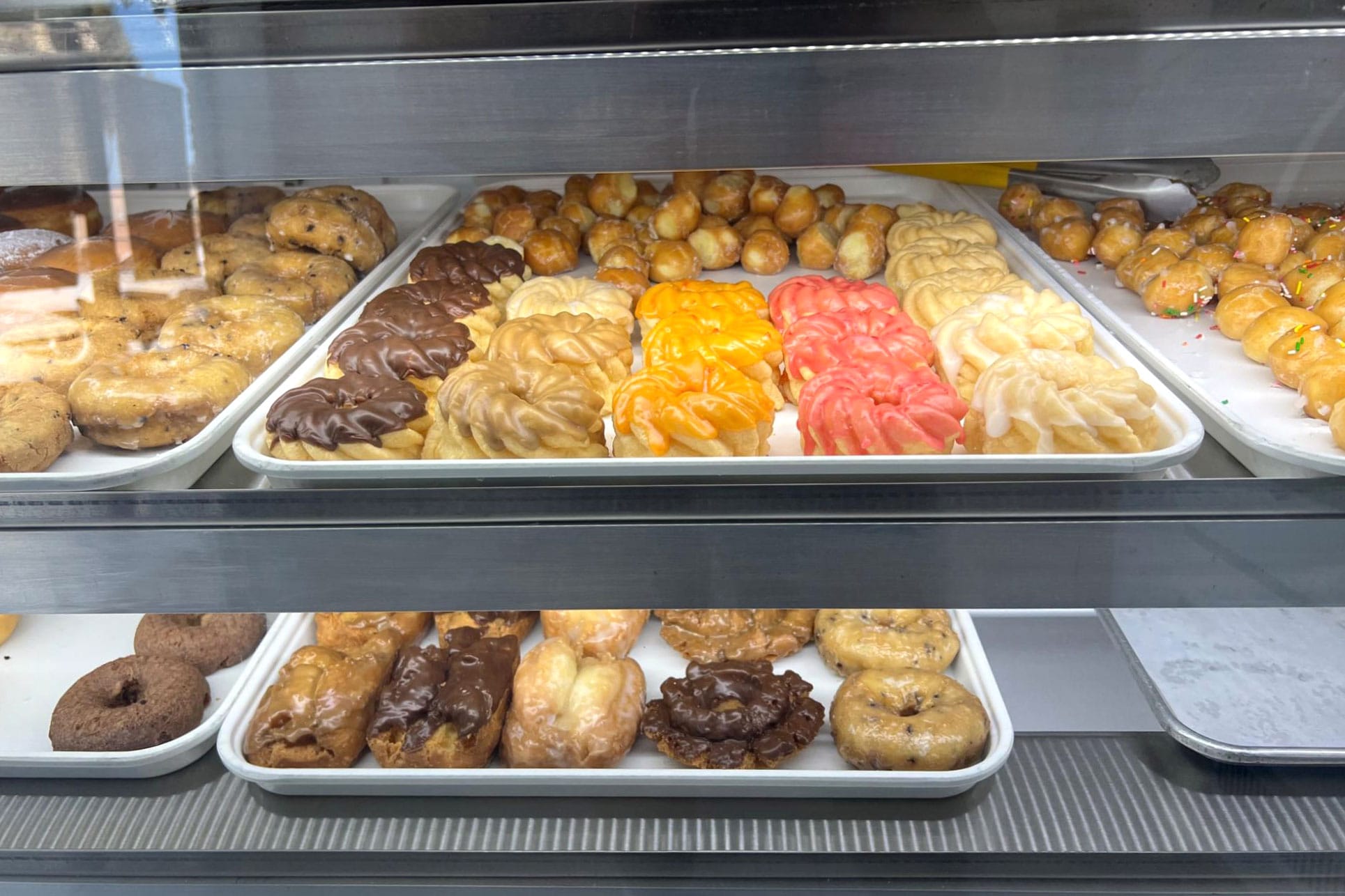 Croissants and other laminated dough pastries (left) and an assortment of cake donuts and yeasted donuts (right) at Steve’s Donuts.