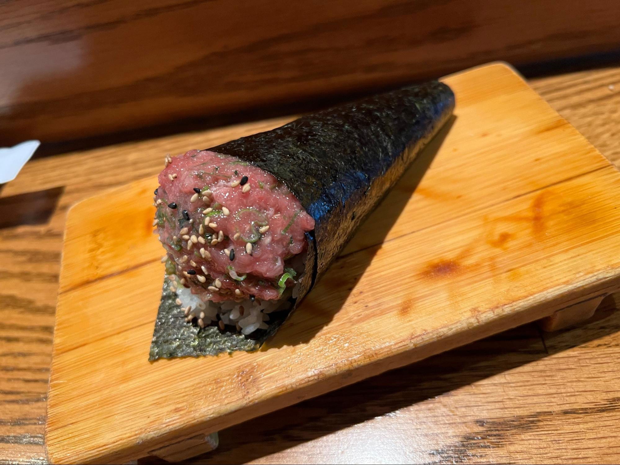 Their handrolls are tight cones of fresh crackling nori, overflowing with rice and your choice of filling. I had a delicious negitoro hand roll, made with chopped-up bits of fatty tuna with scallions, more fresh wasabi, soy, and a sprinkle of sesame seeds.