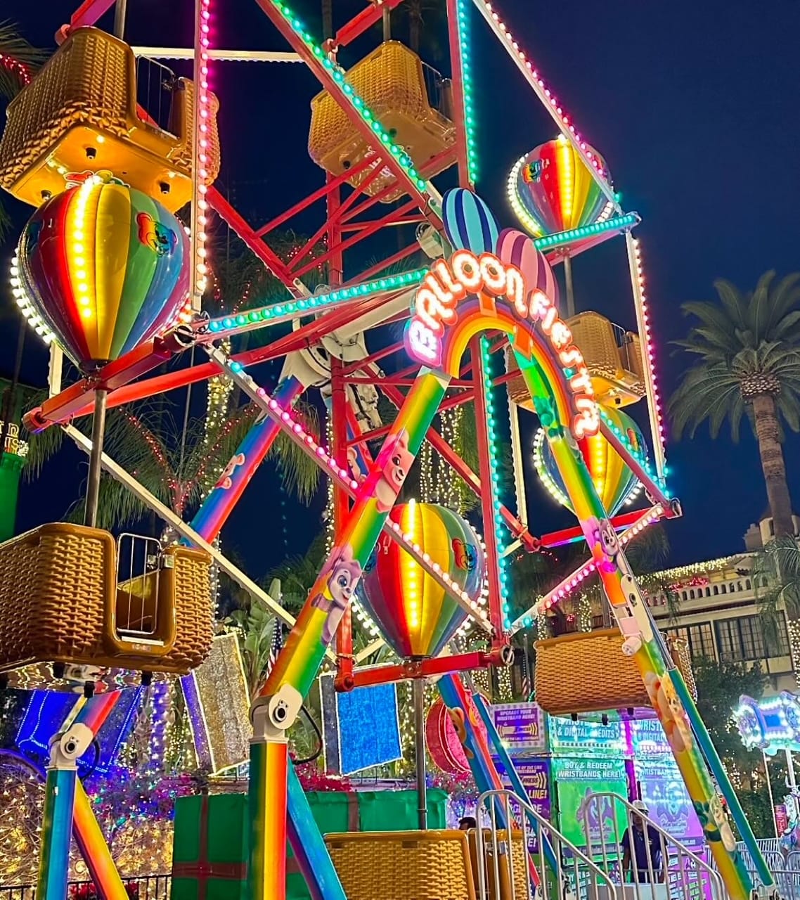 Carnival attractions located at Mission Inn Avenue and Lime Street include Fantasy Carousel, Balloon Ferris Wheel, Santa Cub Swing, Christmas Inflatable Bounce House and Christmas-themed children's games. Enjoy carnival foods such as deep-fried Oreos and funnel cakes.
