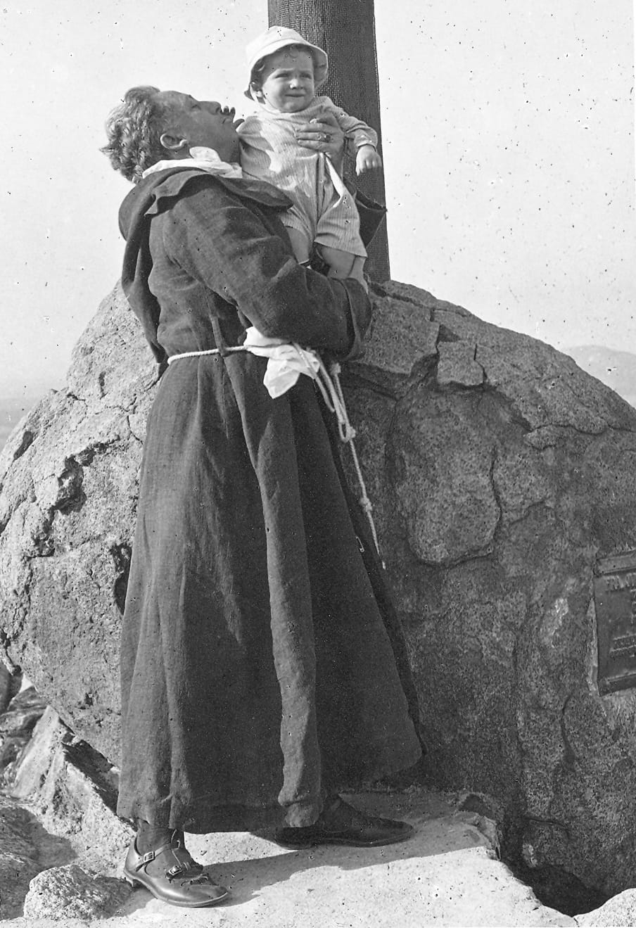 Frank Miller dressed in brown robes of a Franciscan holding his grandson, Frank Miller Hutchings. (Courtesy of the Mission Inn Foundation)