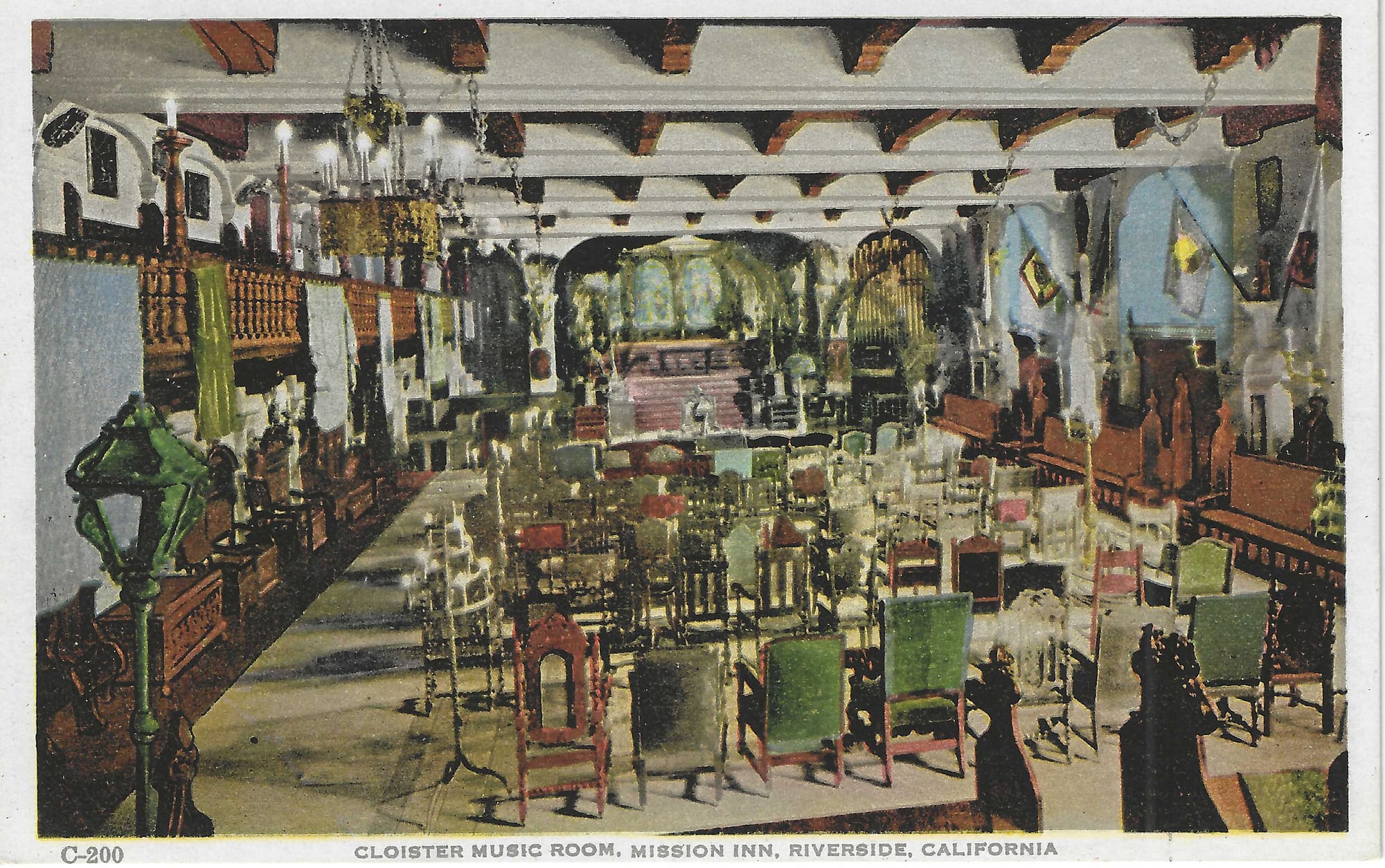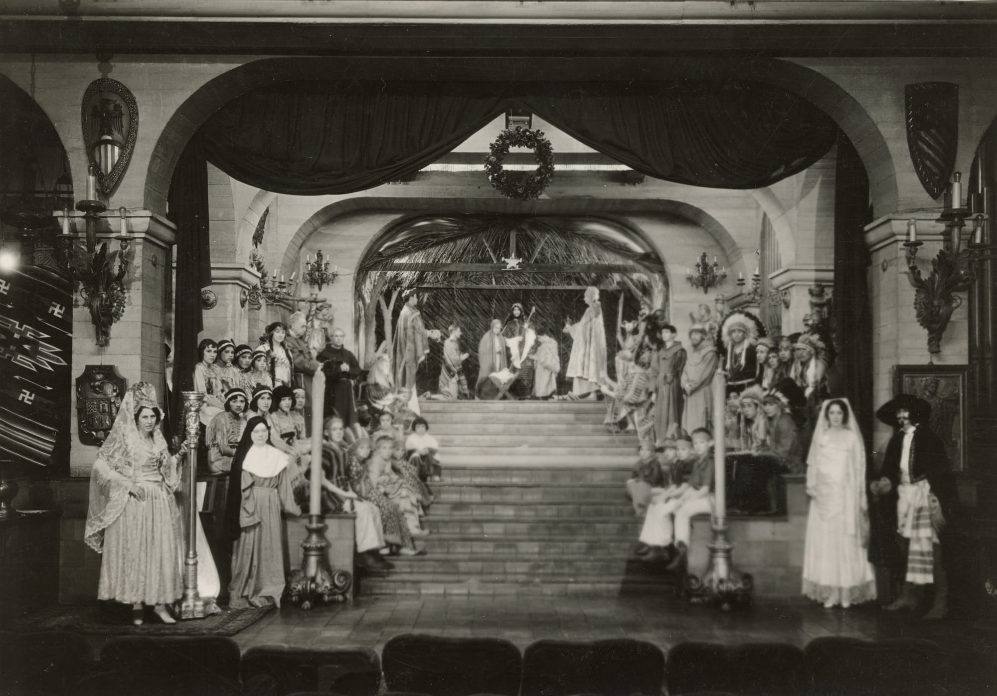 For twenty-some years, Frank Miller staged an annual Nativity Pageant in his Cloister Music Room of his Mission Inn. The play centered around the Nativity account of Christ's birth, with the visits of the Shepherds and the Wise Men. However, completing the scenario was Miller's romanticized version of California history, focusing on the California Missions. His Mission Inn was focused on the concepts and architecture of the Missions. And not just the building, but much of the Inn's artwork and lore also went back to that early California period.