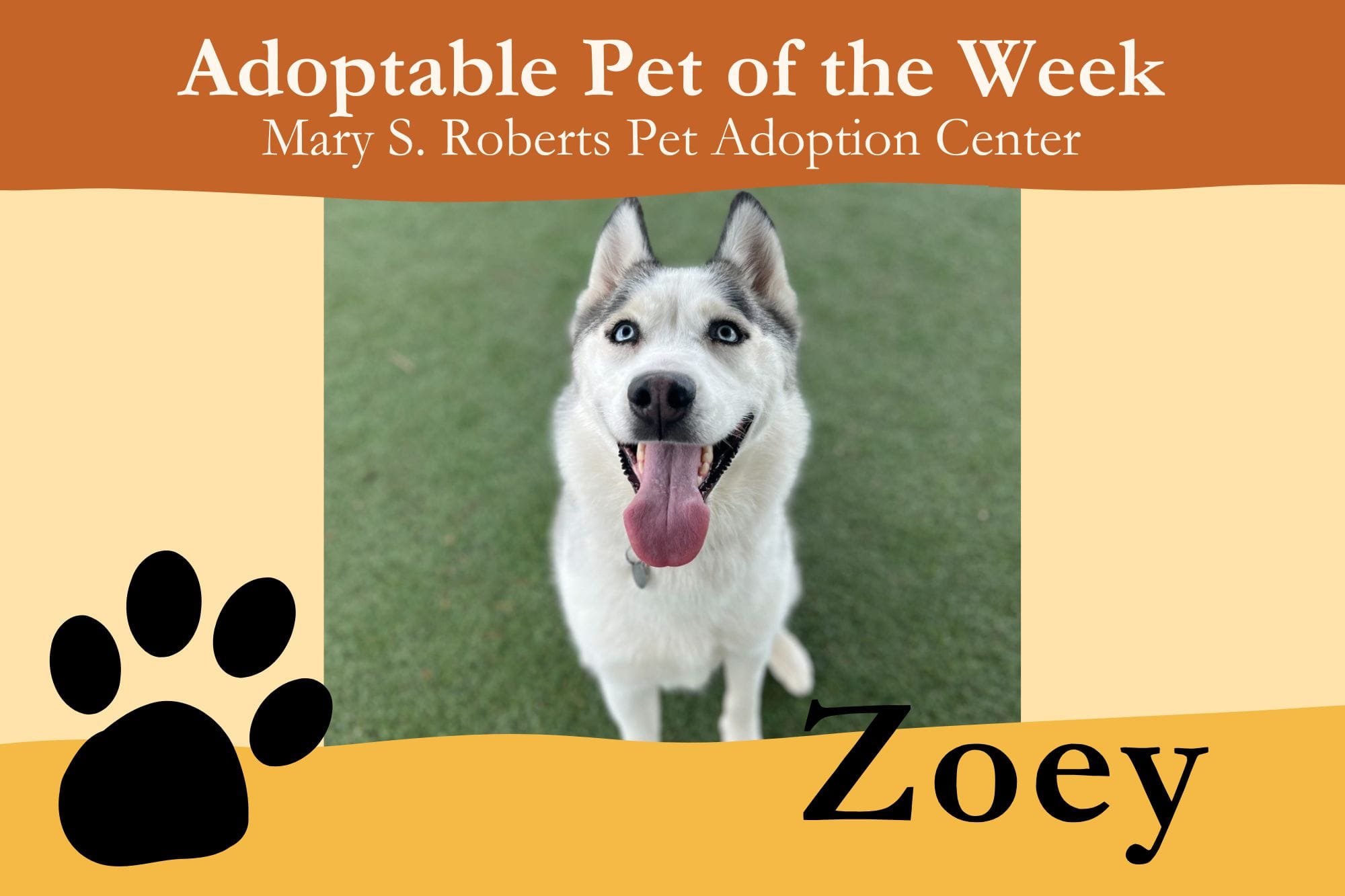 Come meet Zoey and all the adoptable pets at Mary S. Roberts Pet Adoption Center in person. Stop by any day except Tuesdays, from 12 p.m. – 7 p.m., or learn more at petsadoption.org.
