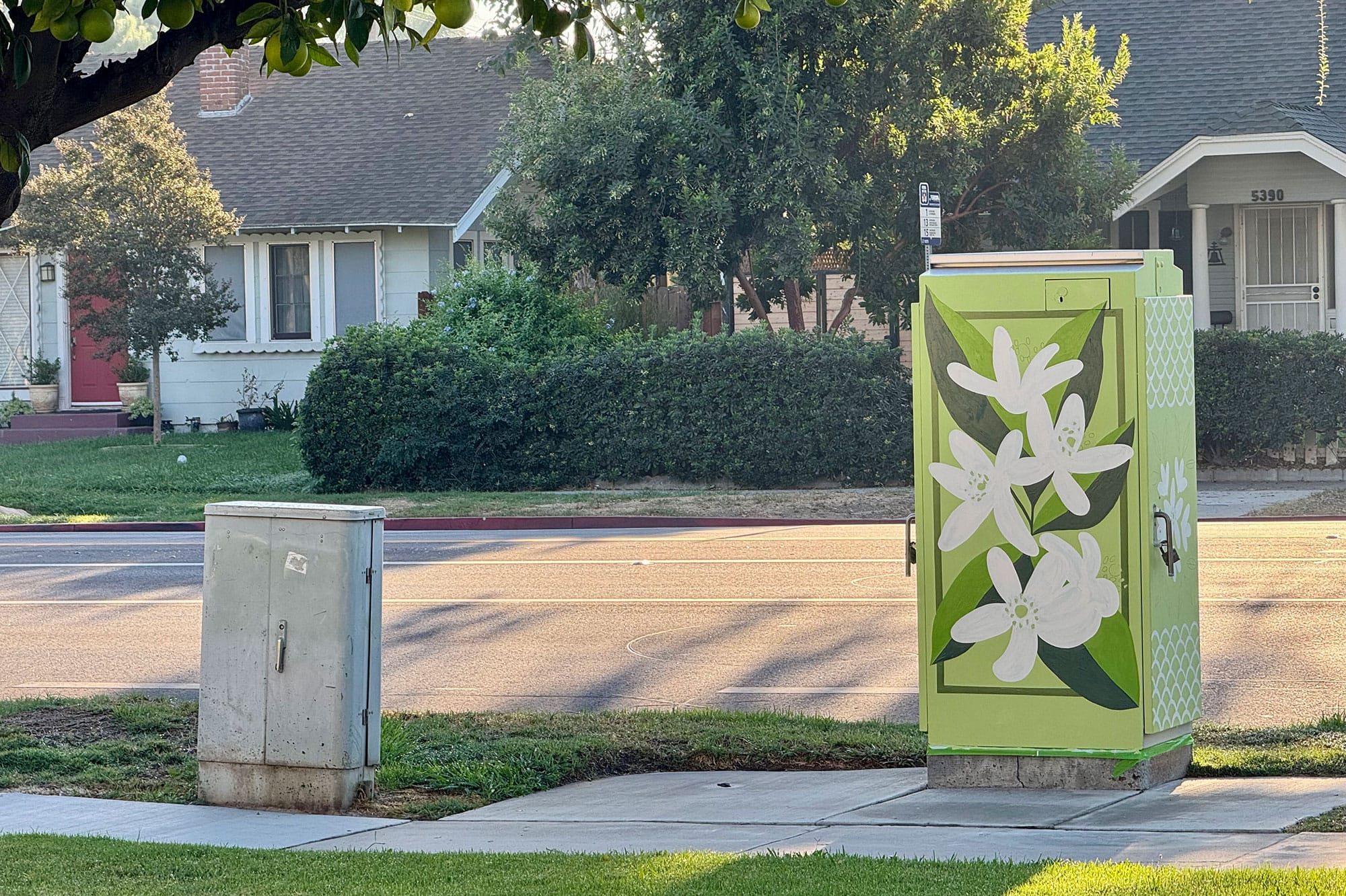 Driving home in my new neighborhood, I noticed a woman painting a base coat on a traffic light control box. It dawned on me that I’d never paid attention enough to know it was there. I knew the box existed and surely had seen it while driving and walking around. I have seen other boxes painted in other places around Riverside, but this box never caught my eye.