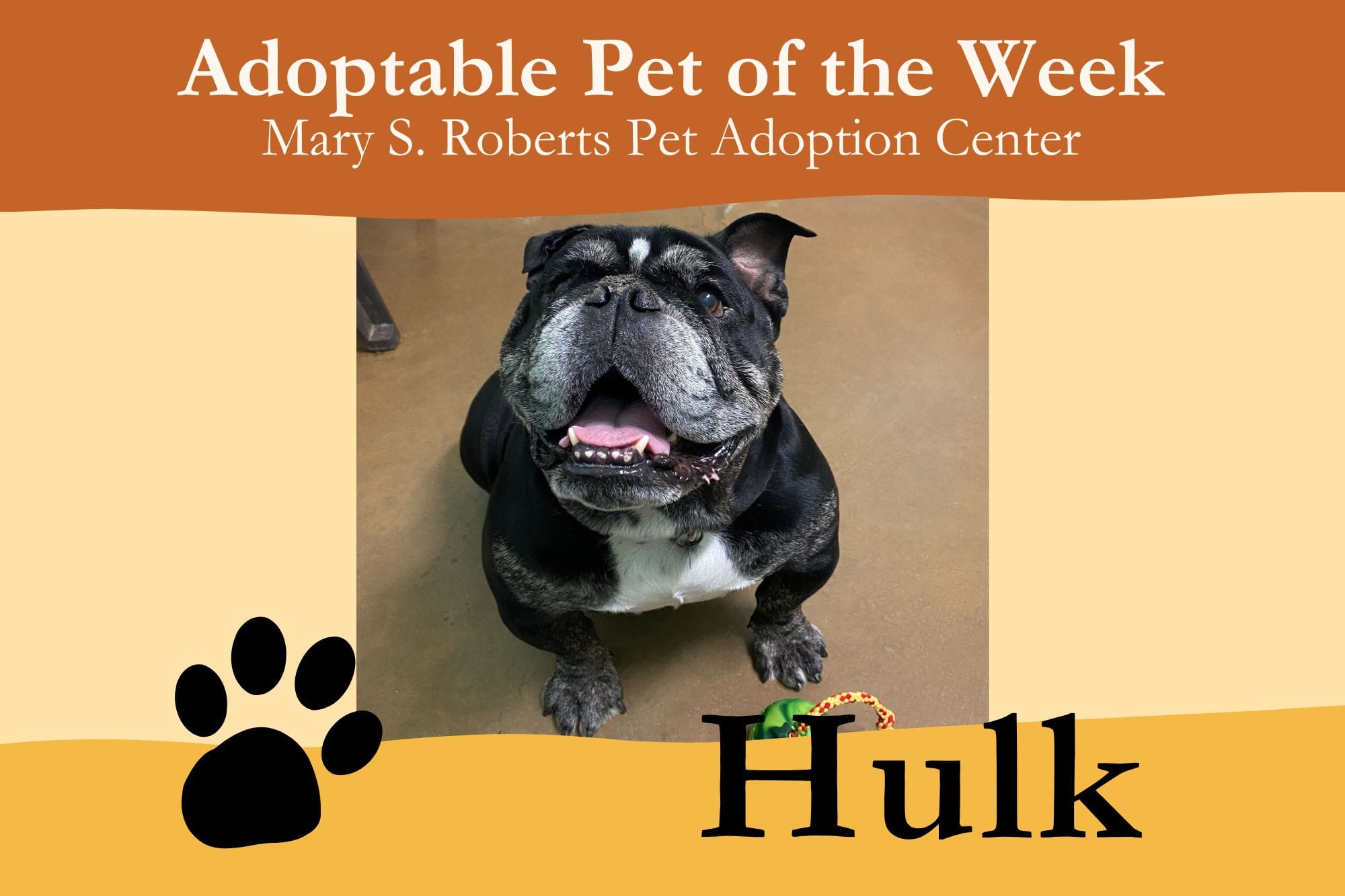 Come meet Hulk and all the adoptable pets at the Mary S. Roberts Pet Adoption Center in person. Stop by any day except Tuesdays, from 12 p.m. to 7 p.m., or learn more at petsadoption.org.