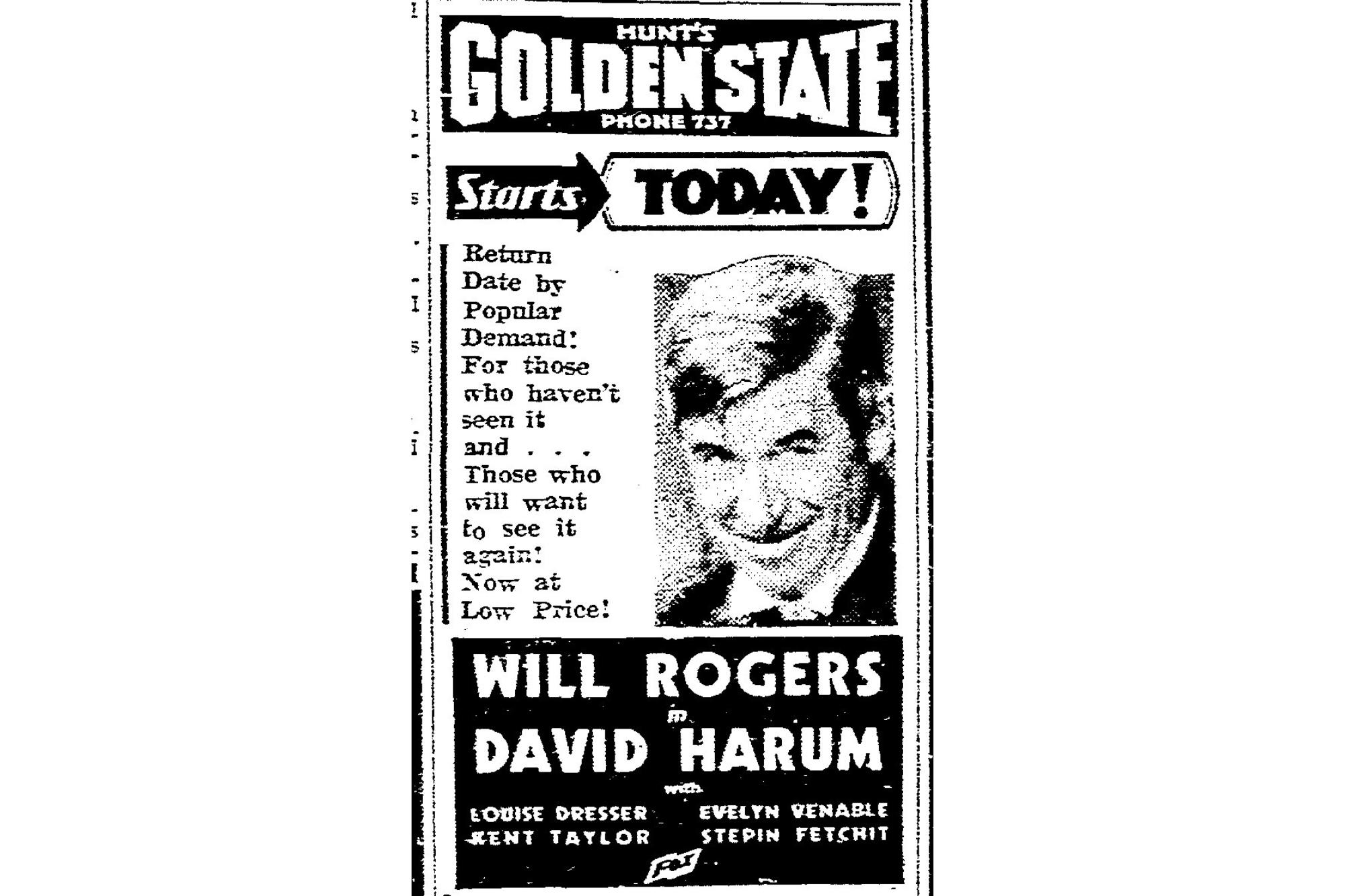 A little over a month later, Roy Hunt, the manager of the Fox Riverside Theater, announced that the picture "David Harum" would have a five-day run in Riverside starting on Tuesday, February 27. The only place the film had been seen before this showing was in Los Angeles, where crowds besieged the theater. A few weeks later, Hunt announced on April 11 a return date for showing Will Rogers in David Harum. This time, the film was shown at another theater managed by Hunt, the Golden State, at 3745 Seventh Street (formerly the Loring Opera House).