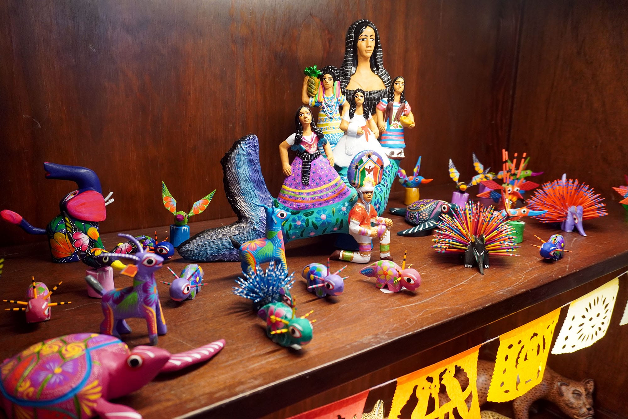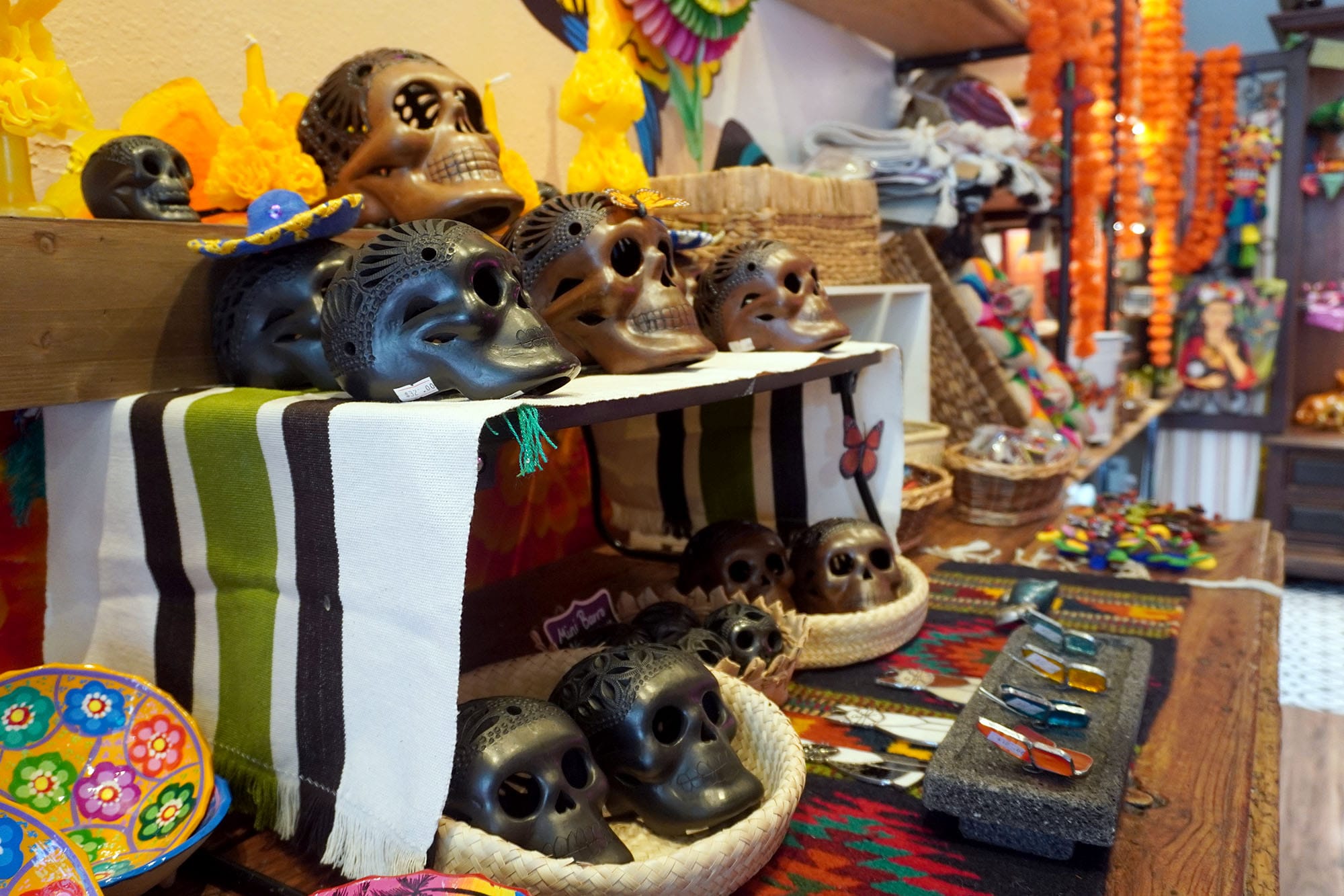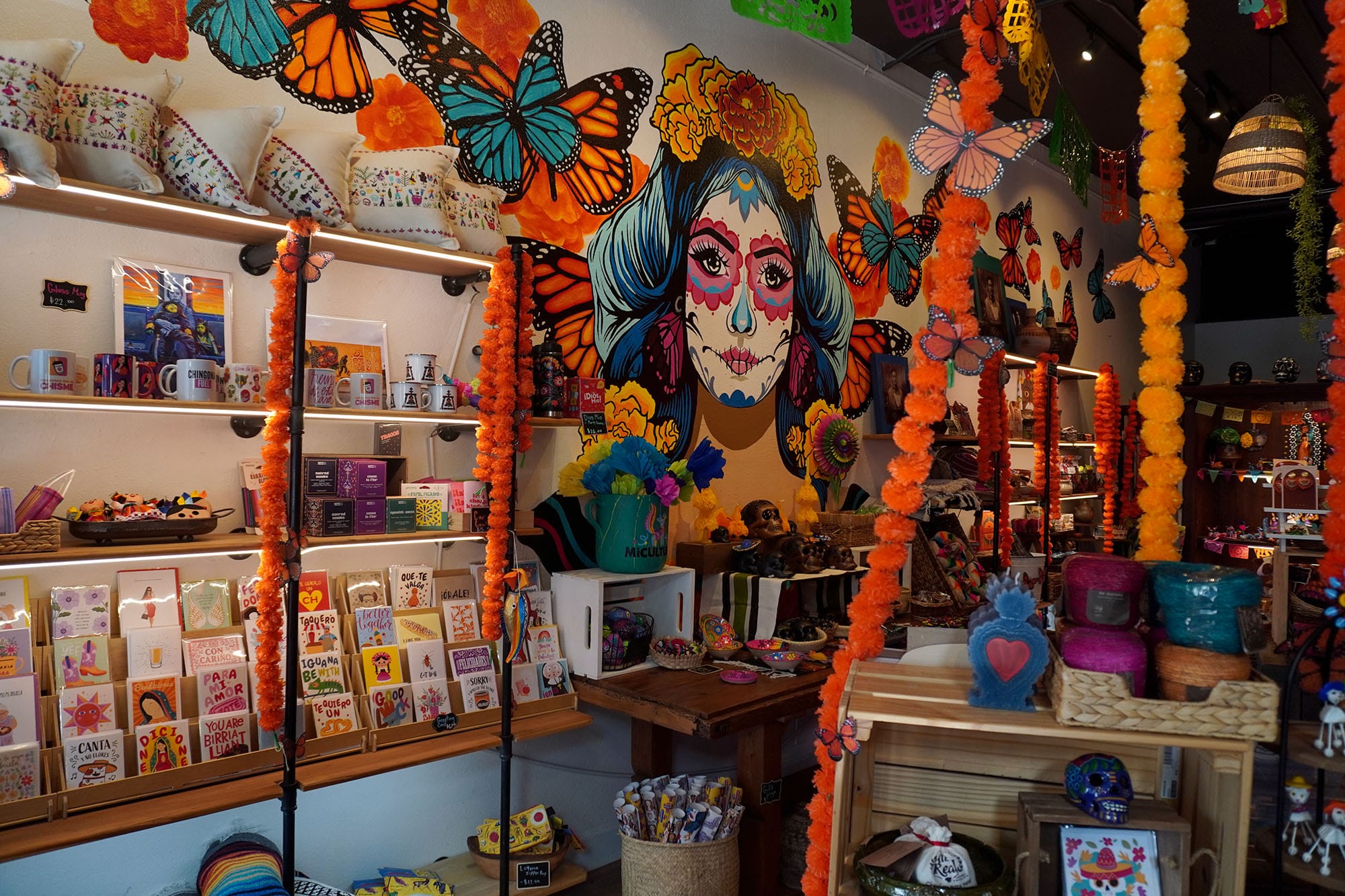 The shop features ceilings decorated with papel picado and items arranged in ofrenda-style displays. A mural wall depicts a catrina with monarch butterflies spreading their wings through the shop.