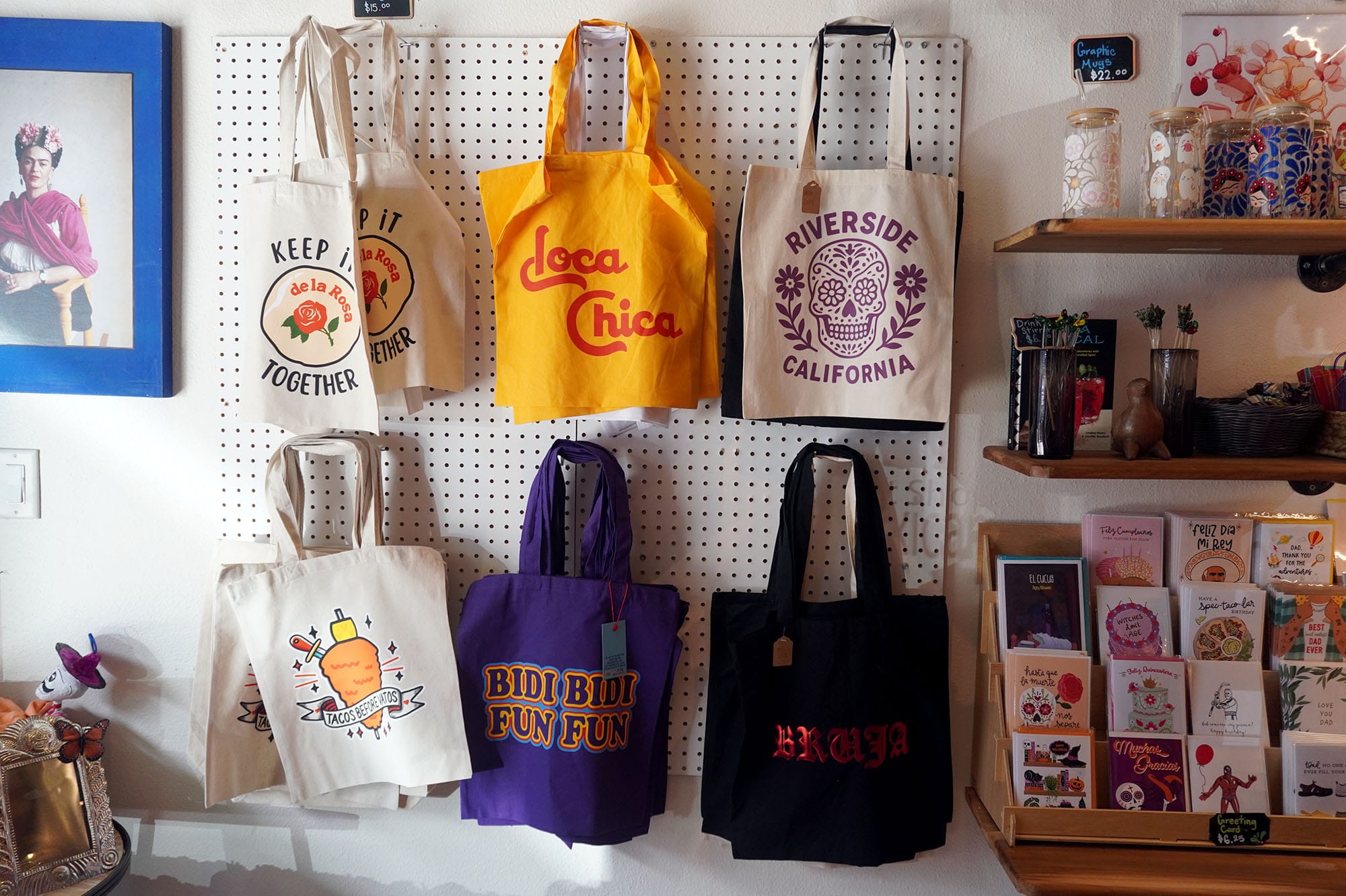 MiCultura offers authentic Mexican merchandise including handcrafted items and Riverside-themed tote bags that celebrate local pride alongside cultural heritage. (Justin Pardee)