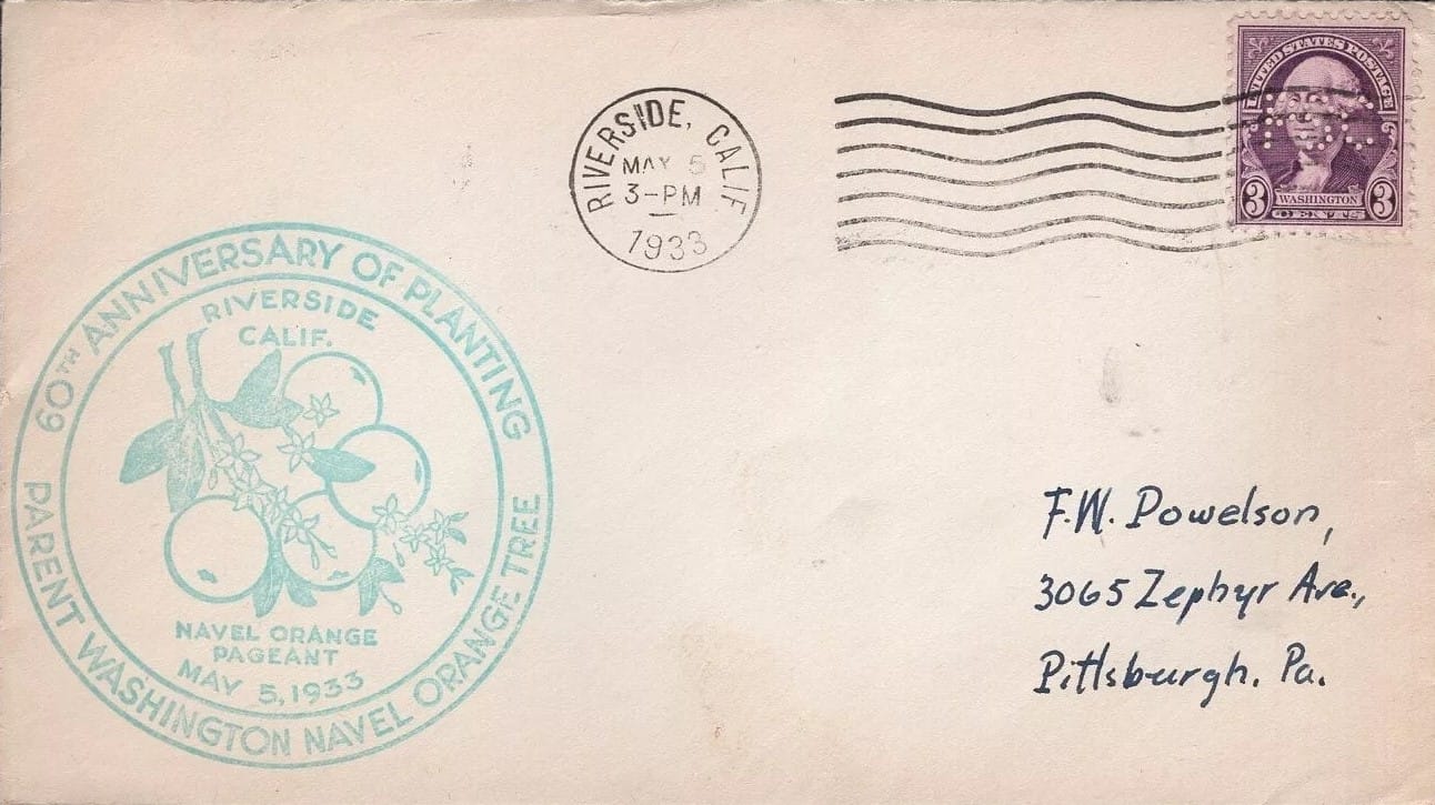 In 1933, for the sixtieth anniversary of planting the first two navel orange trees, the Riverside Chamber of Commerce planned an elaborate celebration: the Riverside Navel Orange Pageant. The name was suggested by Archie Shamel, a well-known plant expert for whom Shamel Park was later named. Photographer Avery Field submitted a tentative design for a special orange tree flag. A banquet at the Mission Inn was planned, and an enormous parade was organized. The hope was that the event would grow to rival the Pasadena Tournament of Roses.