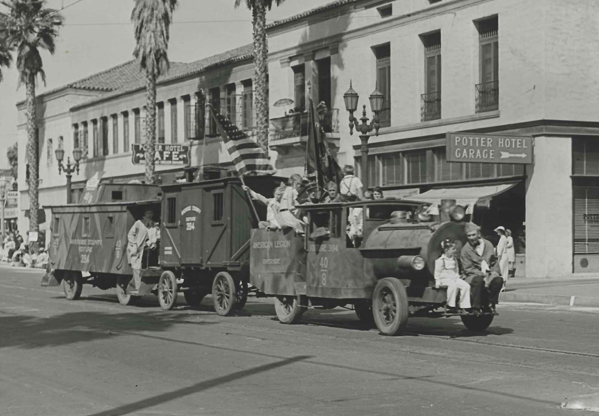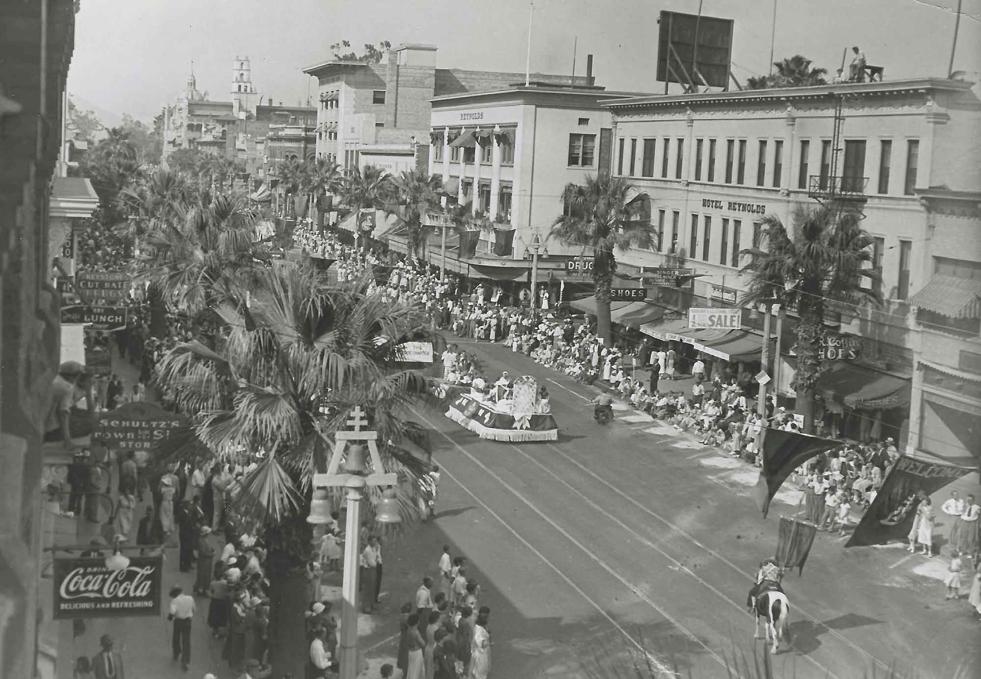 The float entered by the Riverside American Legion must have been a favorite for many, both young and old. A train engine, followed by a boxcar and a caboose holding several children, was caught in a photo taken as the parade passed the former Potter Hotel at 3970 Market Street across from White Park. The railroads played an important role in shipping oranges to far-away markets.
