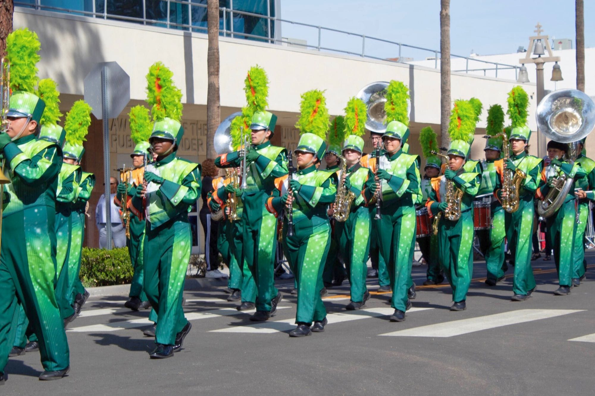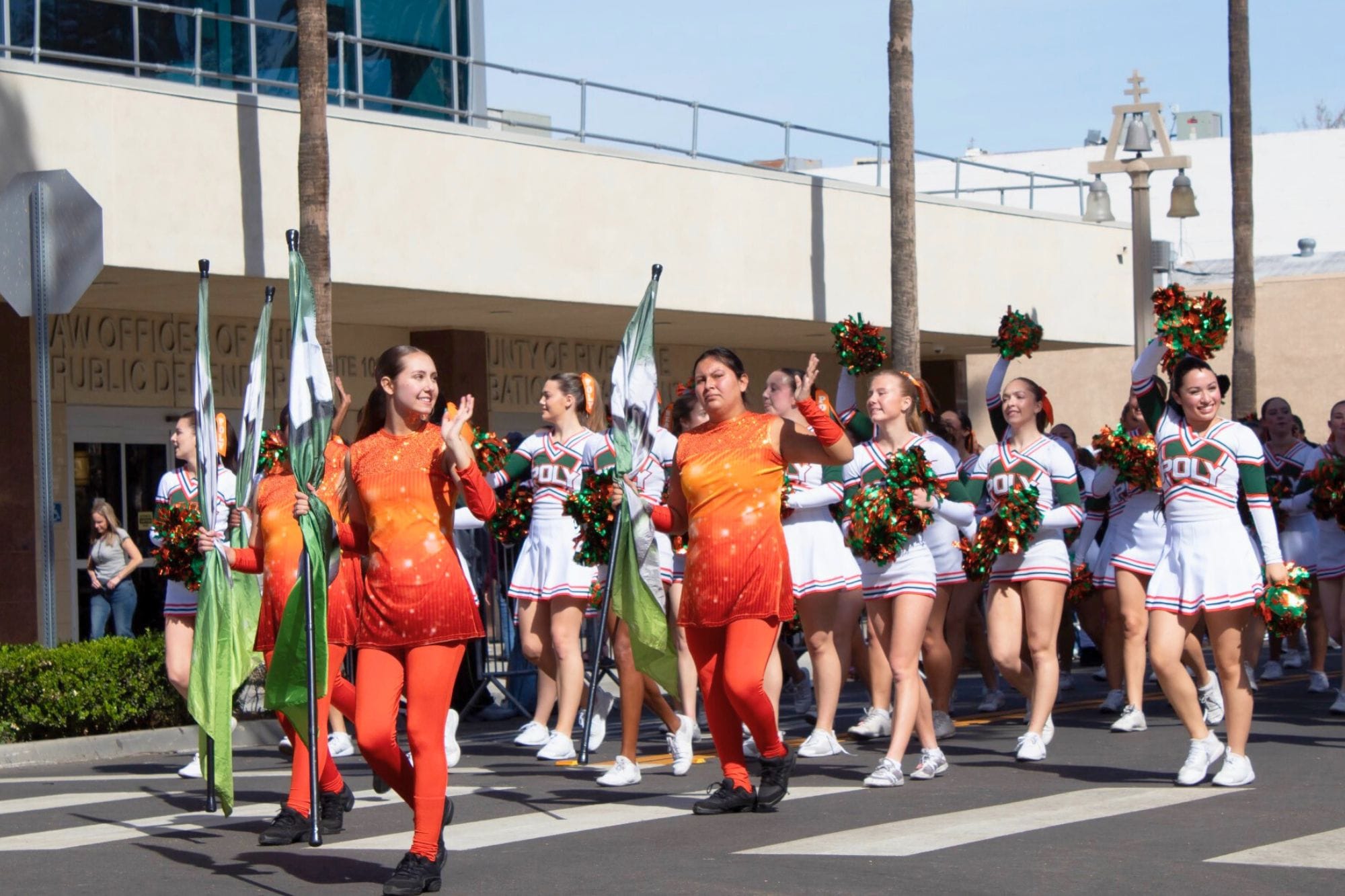 Polytechnic High School band students marched with their instruments alongside their Color Guard, followed by their cheerleading team.