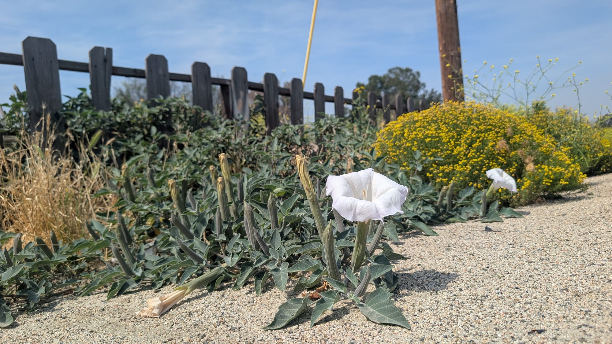 The plant life reflects this as well. On the warehouse side, everything is selected, spaced, and maintained. On the field side, beauty shows up more casually. Yellow wildflowers crowd the roadside. A white trumpet bloom opens out of pale gravel. Weeds push through dry soil and old fence lines. None of it is ornamental in the usual sense, but it is not hard to admire. It is the beauty of things that can survive where they are not especially invited.