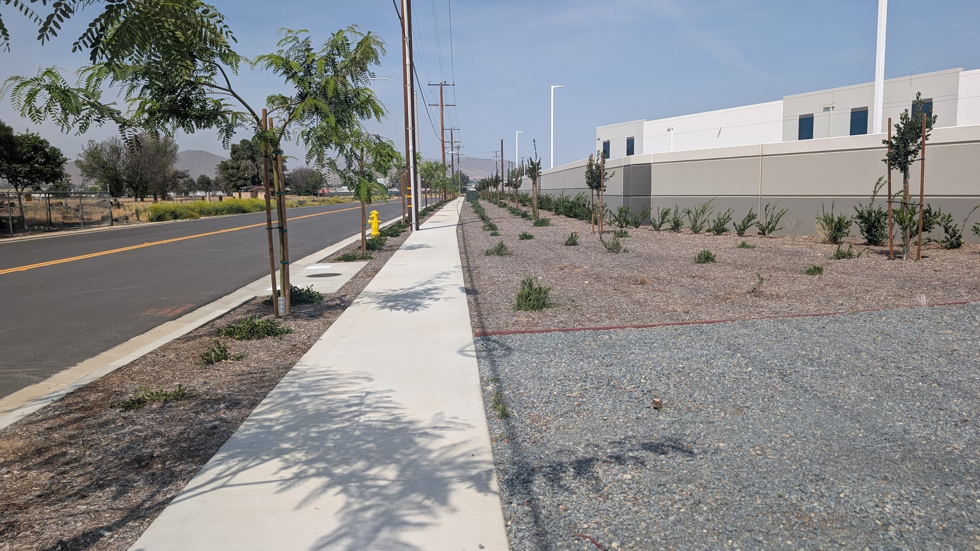 Coming back two years later, what strikes me is how much has changed in a short time, and how much still has not. The warehouse is finished. Its landscaping is in, the sidewalk and curb and gutter are complete, and the back side of the property now looks planned five years into the future. The young uniform trees are staked. The shrubs sit in ordered lines. The building is all sharp edges, clean walls, and deliberate geometry.