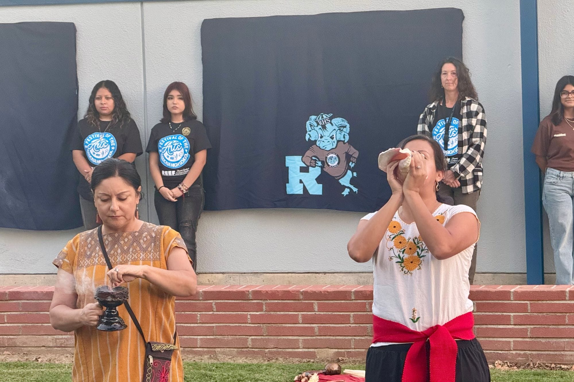 Several fine arts students have been working on a four-part mural on the outside wall of the guidance office. The mural represents indigenous and Chicano culture and is a tribute to the artists and their community. The covered murals were honored with a Four Directions Ceremony before the public unveiling.