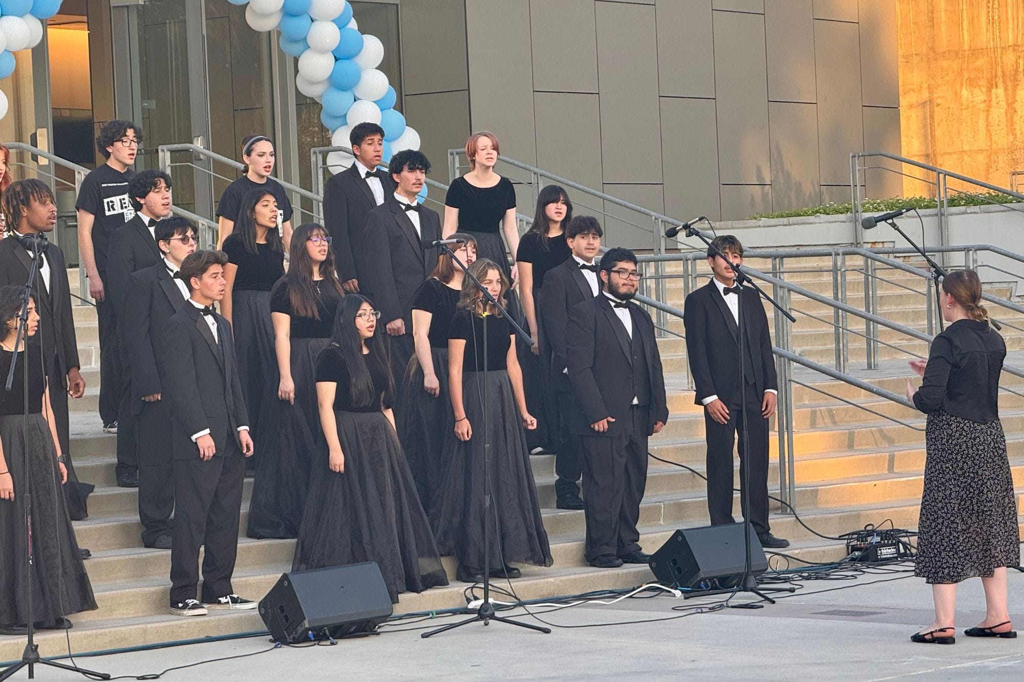 Beyond the arts programs offered at traditional campuses, Riverside Arts Magnet allows students to participate in more groups and projects. There are five choirs and visual art focuses, such as ceramics and studio art. Several groups were performing at the Festival. Several students quickly changed from formal show choir to musical theater performances of RENT. There were Ballet Folklorico dancers, visual arts exhibits, and stations for the student-managed wardrobe department.