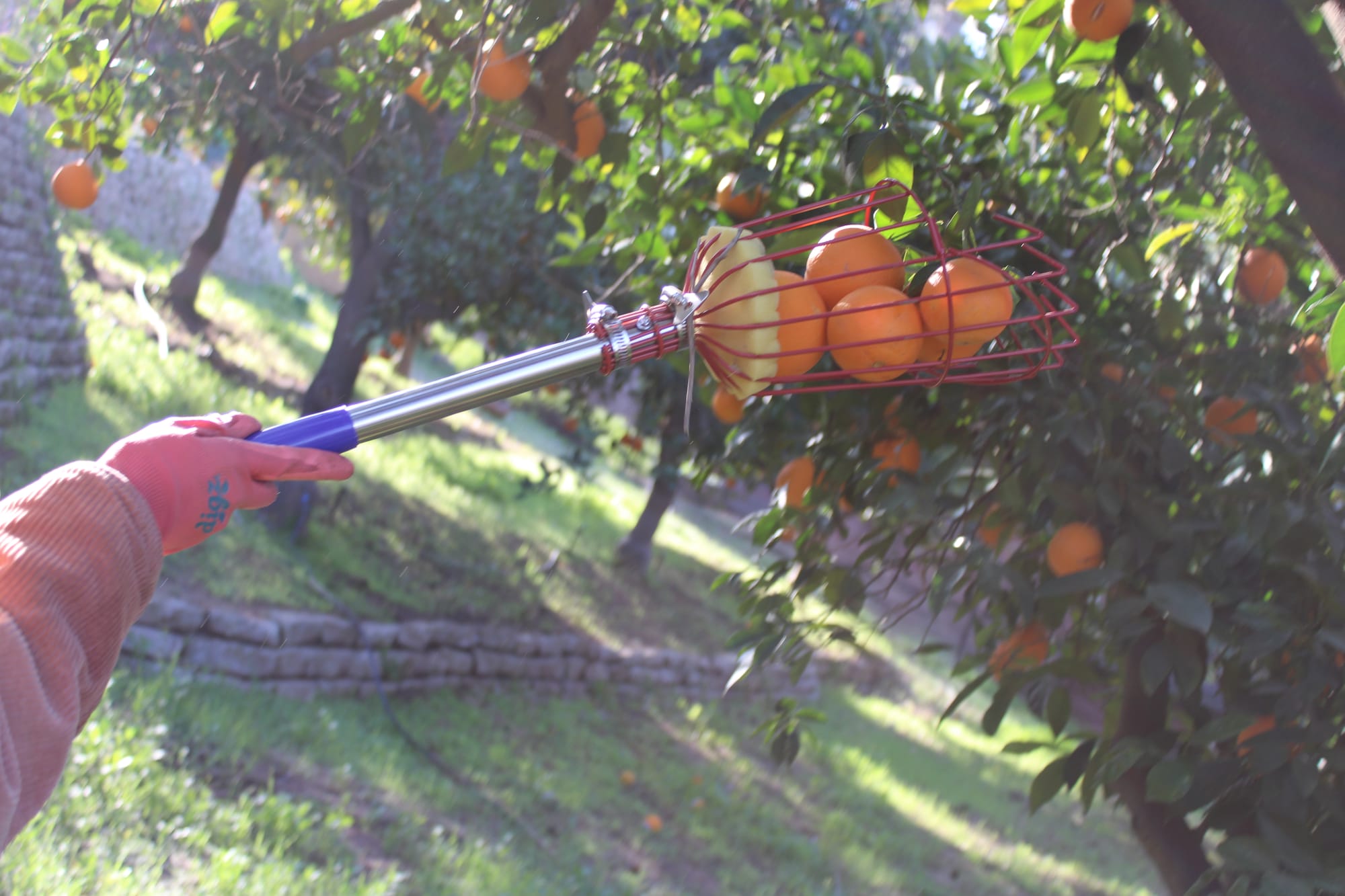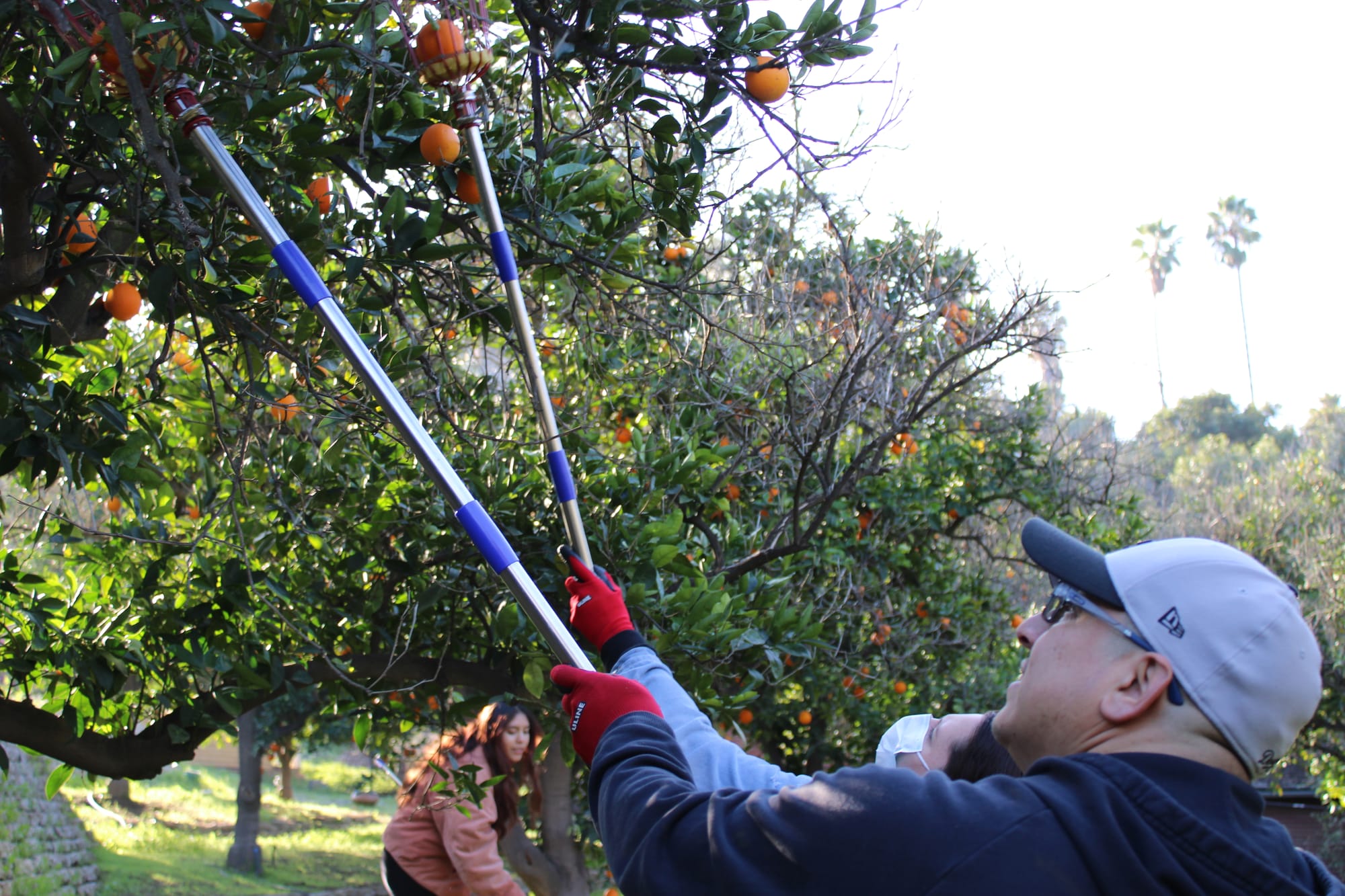 Volunteers use specialized fruit-picking tools to harvest citrus from Inland Empire properties during Feeding America Riverside | San Bernardino gleaning events. The food bank conducted 33 gleanings in 2025, collecting nearly 24,000 pounds of fresh produce for distribution to families facing food insecurity. (Courtesy of FARSB)