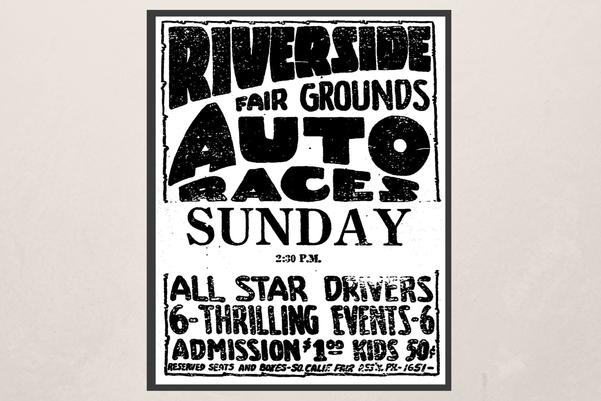 Or you could stay in town, go to the Fairgrounds near Fairmount Park, and watch the Auto Races on Sunday afternoon. Racing had been held during the Southern California Fair season, but in 1924, the Fair Committee set up races for Sunday afternoons. The cost was $1 for adults and 50 cents for kids. However, the local ministerial associations protested the Sunday use of the grounds. Remember, most businesses were closed on Sundays, yet the races went on.