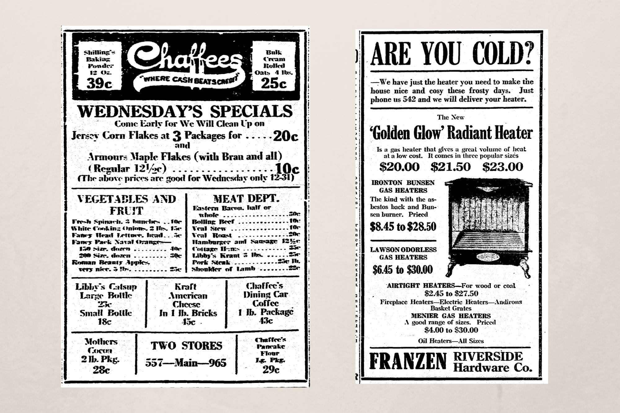 With the cooler weather, how warm was your house? If you needed a new heater, Franzen Hardware was the place to go. Prices ranged from $2.45 to $30, and wood, coal, gas, oil, and electric models were available. And they even delivered.