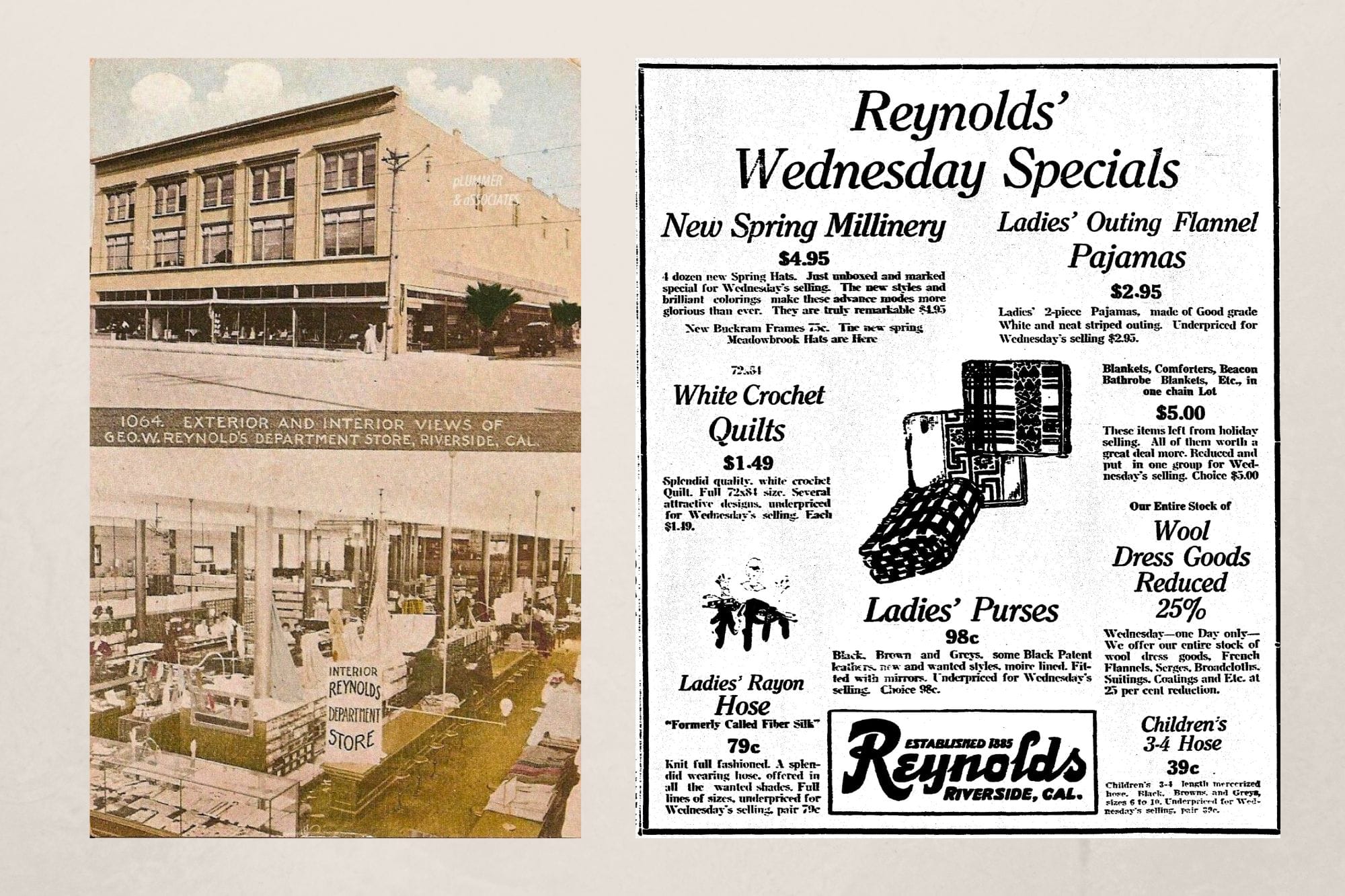 There were several department stores in downtown Riverside where you could find clothes and accessories. The best-known two were Rouse’s and Reynold’s. Rouse’s Department Store was on Main Street between Eight and Ninth Streets in the building that today is part of the Barbara and Art Culver Center of the Arts. In its day, it was the place where the high-fashion-conscious would do their shopping. A December 1924 ad before Christmas (without prices) listed such items as Perrin Gloves, Chinese-designed Handkerchiefs, Elizabeth Arens toilet goods, Van Raalite pure-thread silk stockings, and Omar Pearls. You had to visit the store to find the prices if you were looking for such fancy items.