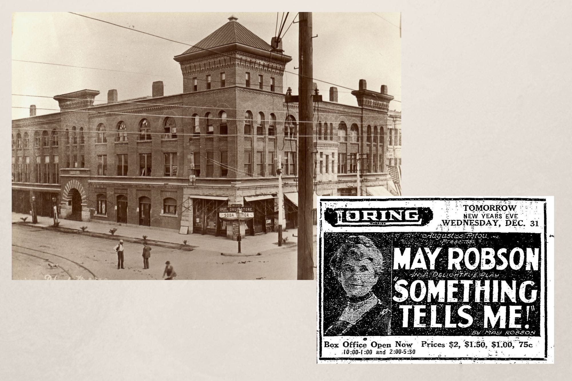 For entertainment, you could come downtown for a New Year’s Eve presentation of the play “Something Tells Me!” starring May Robson. Seat prices ranged from 75 cents to $2 at the Loring Theatre on Seventh Street, part of the Loring Building on the corner of Main and Seventh.