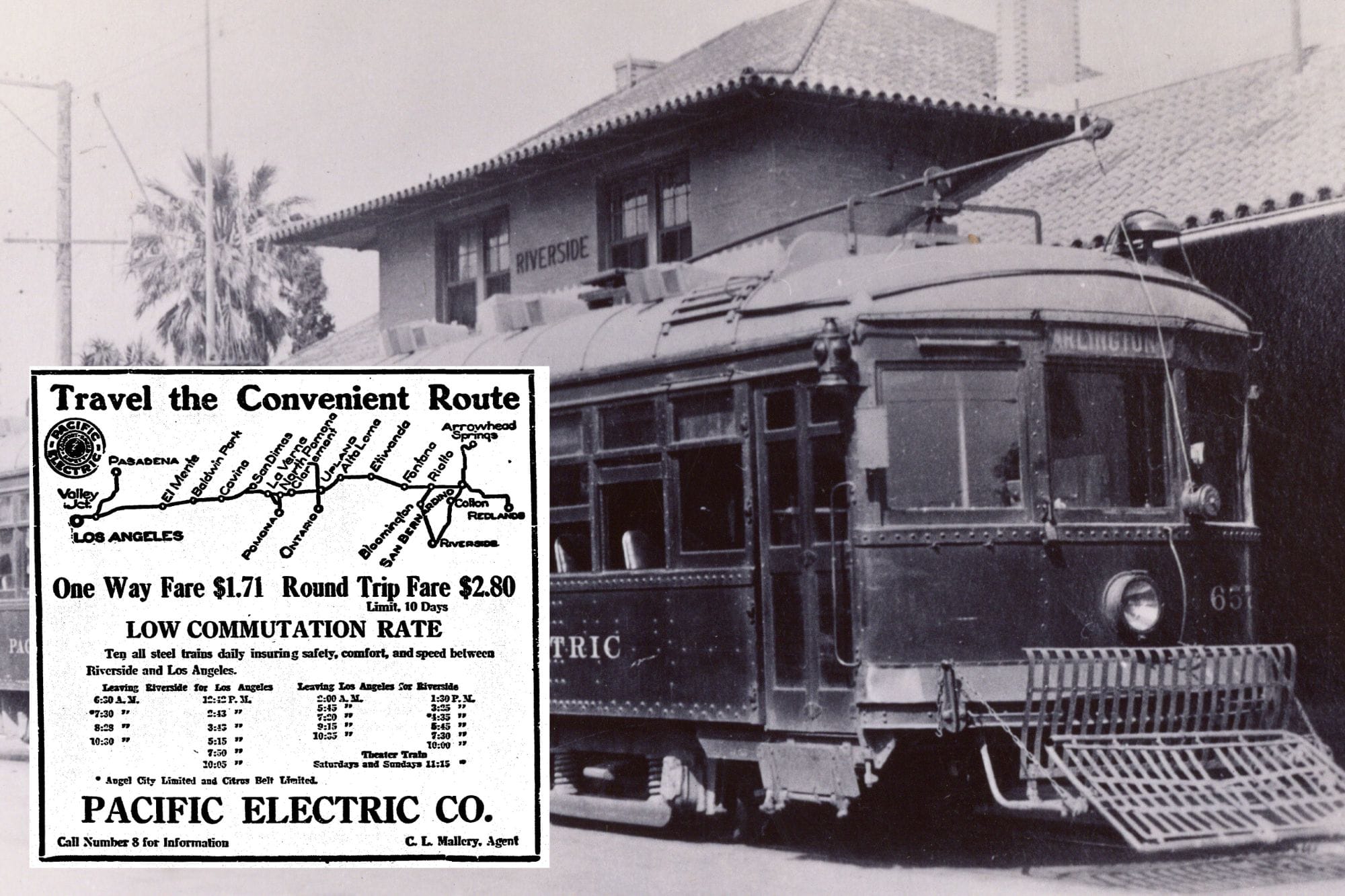 For a quick trip out of town to Los Angeles, you could jump on the Pacific Electric, leaving in the morning and returning that evening. Or you could stay over for up to ten days. The cost? One way ticket was $1.71, and a round trip was $2.80. You left from the old Southern Pacific Depot near Market and Seventh Streets.