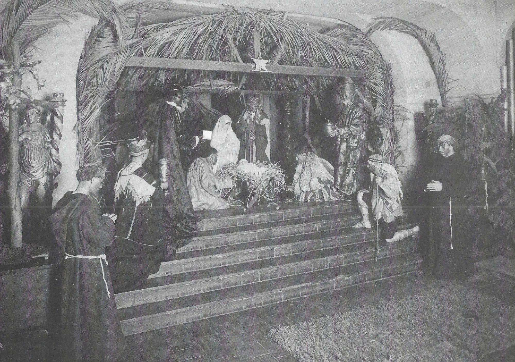 Frank Miller of the Mission Inn started a Christmas tradition in 1915. In the Cloister Music Room, Miller, his family, and staff from the Inn performed a Christmas Pageant. With Miller's love of the romanticized stories of the California Missions (upon which the very architecture of the Mission Inn was based), he developed a play in which Nativity scenes from the life of St. Francis, and as he perceived Father Serra, were performed to tell the Christmas story to the Native Americans at the California Missions.