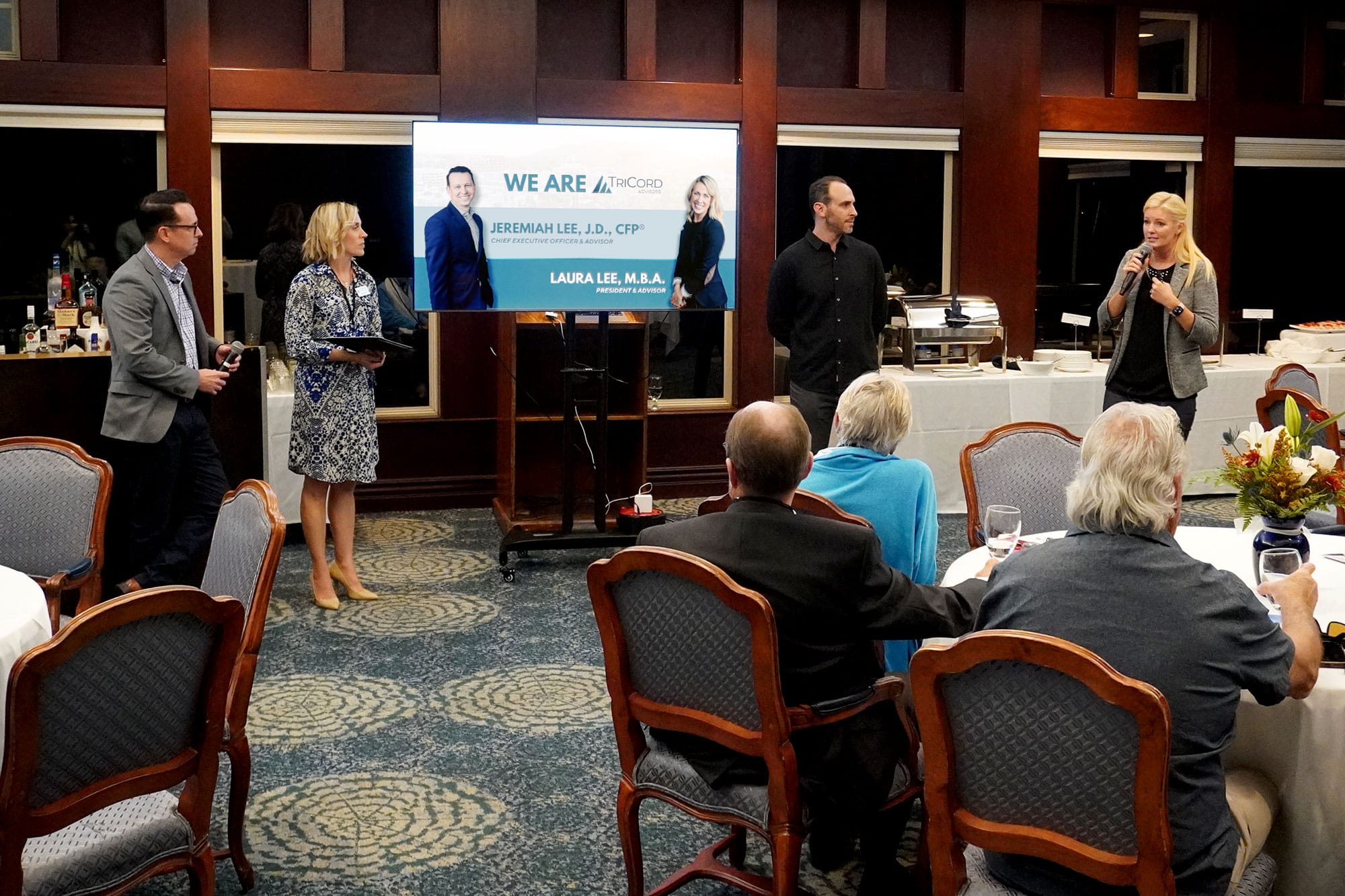 TriCord Advisors' Jeremiah and Laura Lee (left) and Stance Commercial Real Estate's Joe and Heidi Stance (right) discuss commercial real estate investment strategies at a Nov. 12 workshop at Victoria Country Club. (Courtesy TriCord Advisors)